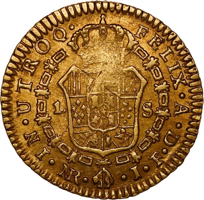 COLOMBIA, Bogotá, gold bust 1 escudo, Ferdinand VII (bust of Charles IV), 1820 JF, ex-JEAS. Restrepo-122.27; KM-64.1; Cal-1559. 3.19 grams. Final year of Spanish colonial escudos from Bogotá. XF on a broad flan with weakly struck center detail, light surface hairlines. Pedigreed to the JEAS Collection.