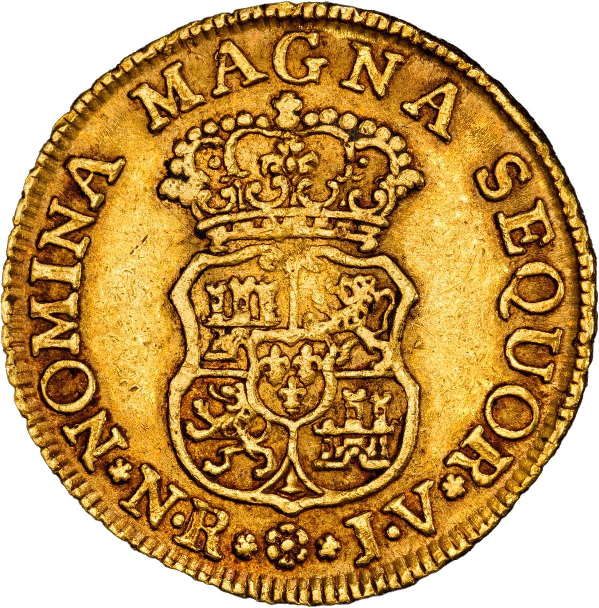 COLOMBIA, Bogotá, gold bust 2 escudos, Charles III (bust of Ferdinand VI), 1760 JV, rare, PCGS AU55,