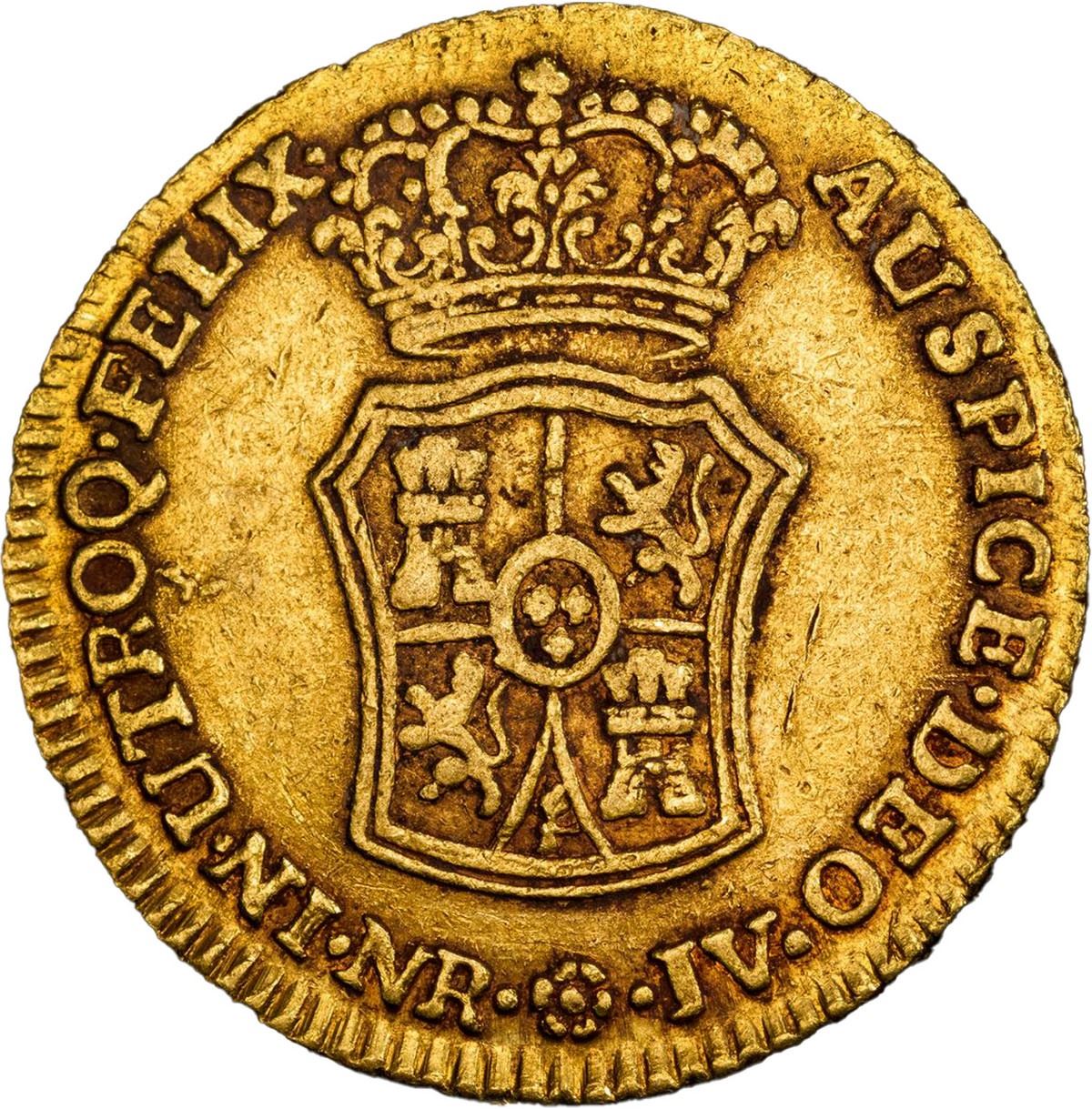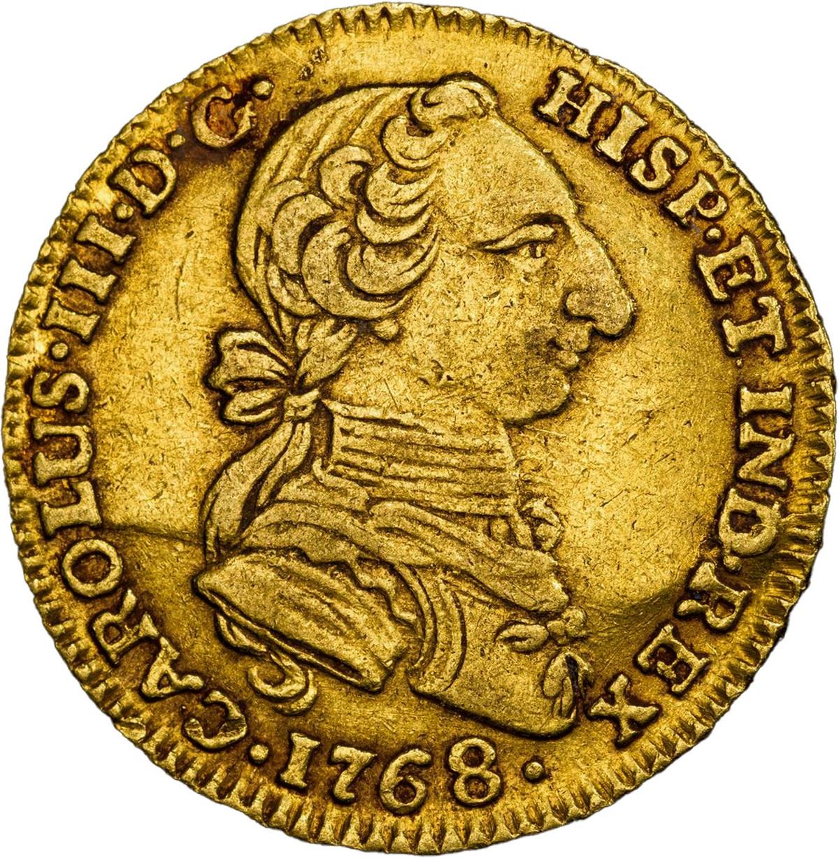 COLOMBIA, Bogotá, gold bust 2 escudos, Charles III ("rat nose" bust), 1768 JV, PCGS XF45. Restrepo-60.14; Cal-1681; KM-40; Fr-33. Bold details enhanced by toning in crevices, die crack across shoulder, nearly full rims, generally rare type.