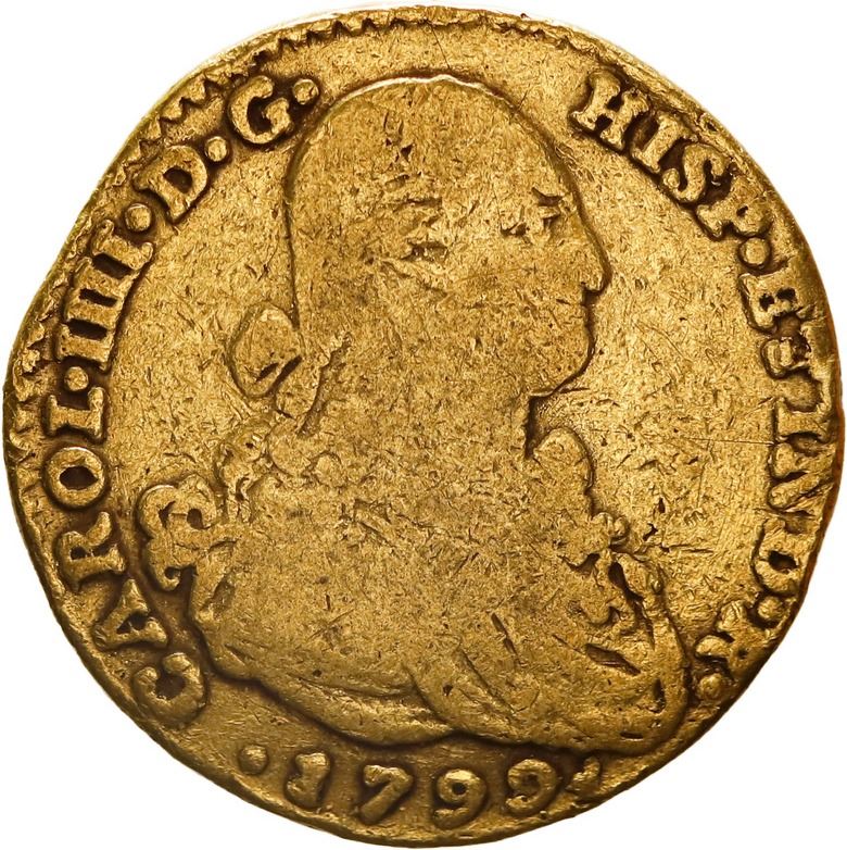 COLOMBIA, Bogotá, gold bust 2 escudos, Charles IV, 1799 JJ.