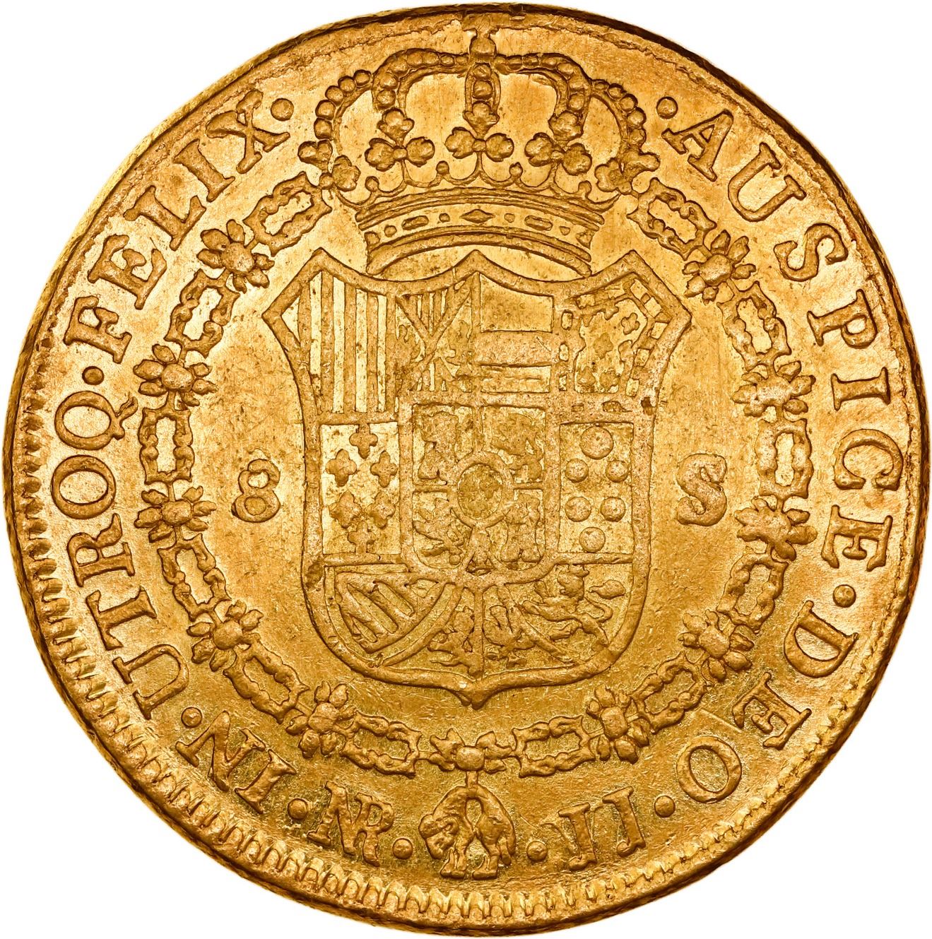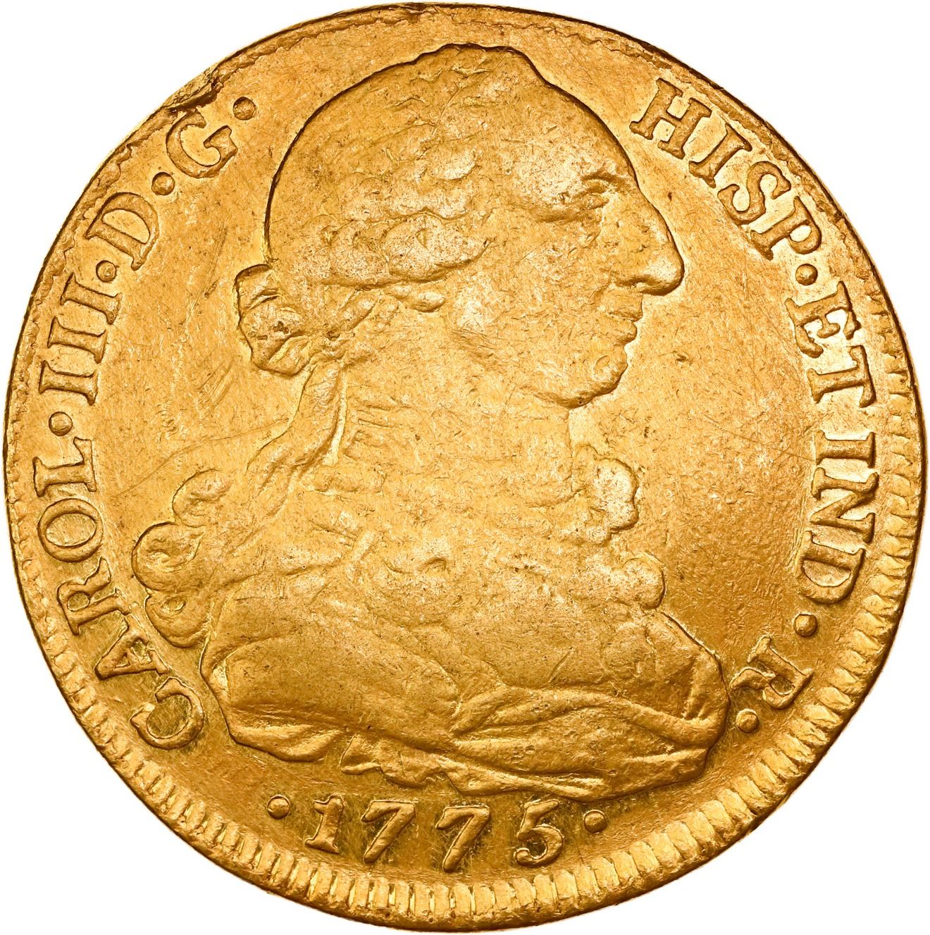 COLOMBIA, Bogotá, gold bust 8 escudos, Charles III, 1775 JJ/VJ, ex-JEAS. Restrepo-72.9; KM-unl (50.1 for type); Cal-2101; Fr-35. 26.79 grams. AU- with much luster on reverse, light marks on obverse, slightly off-center strike making for partially weak rims (also rim-bump on obverse), scarce and clear over-assayer. Pedigreed to the JEAS Collection.