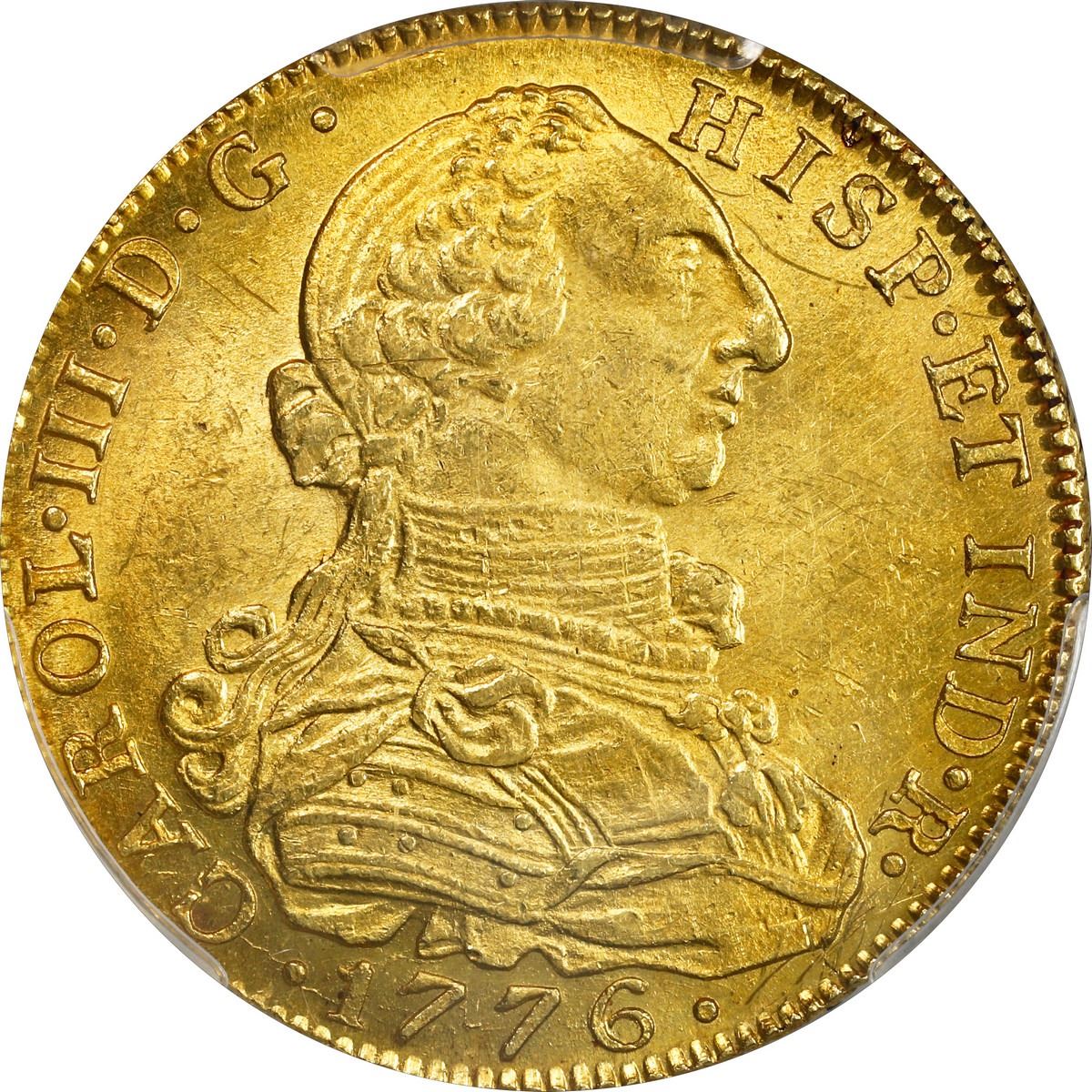 COLOMBIA, Bogotá, gold bust 8 escudos, Charles III, 1776 JJ, no dot in assayer, PCGS UNC details / tooled. Restrepo-72.12a; KM-50.1; Cal-2103; Fr-35. Lustrous piece with sharply struck details, some scratches above and below the bust as well as over FELIX on the reverse, popular date as the same year of U.S. independence.