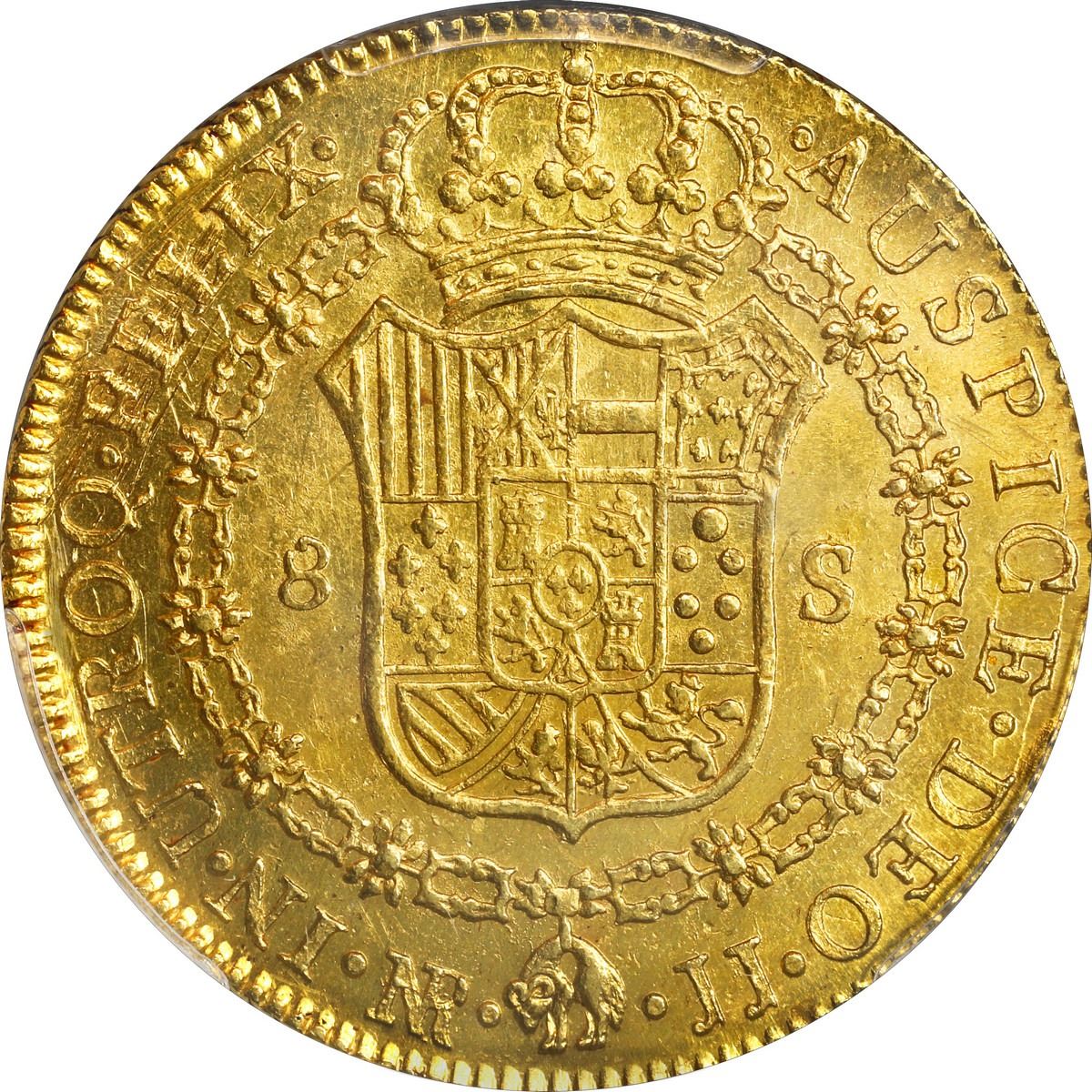 COLOMBIA, Bogotá, gold bust 8 escudos, Charles III, 1776 JJ, no dot in assayer, PCGS UNC details / t