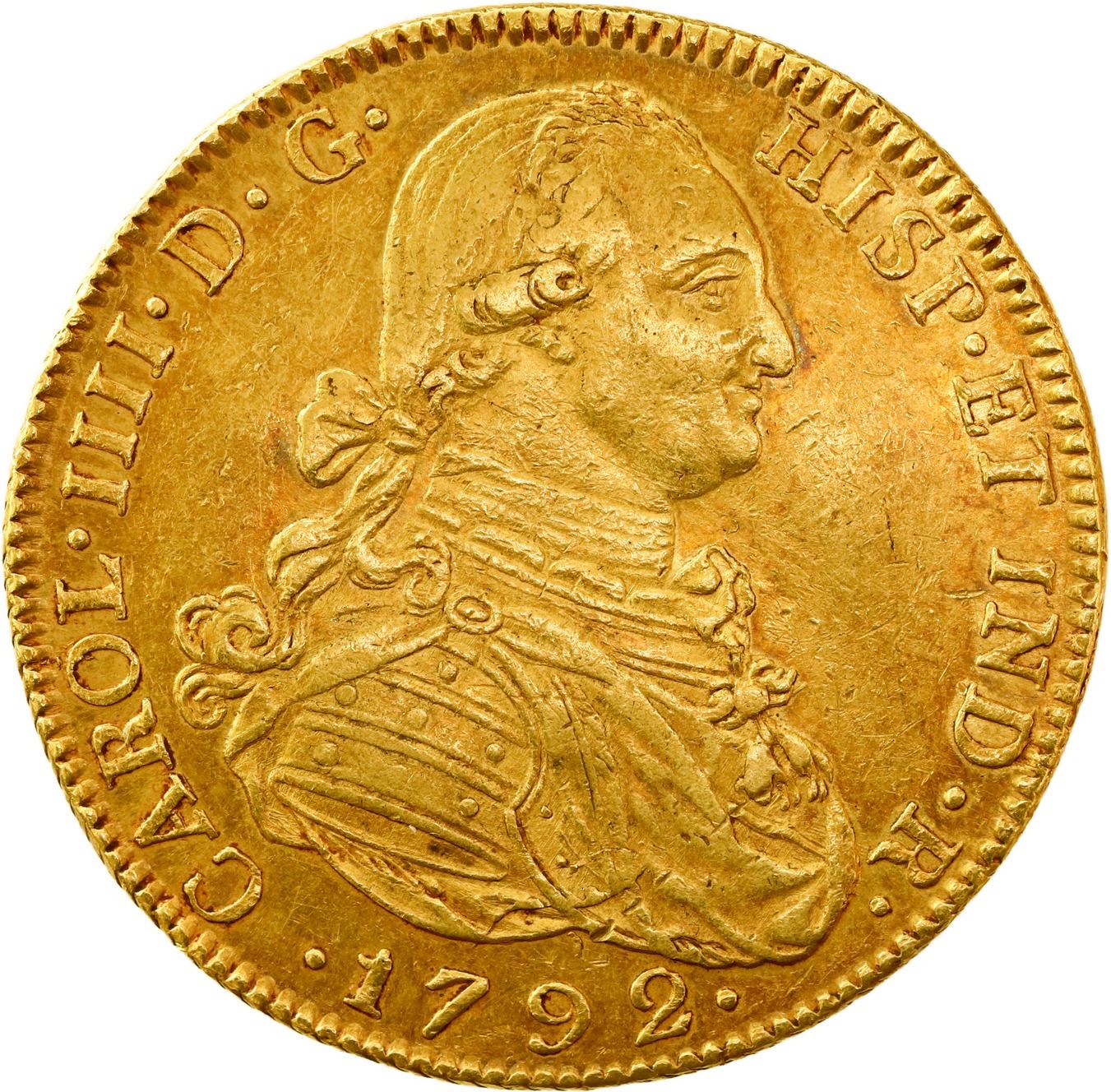 COLOMBIA, Bogotá, gold bust 8 escudos, Charles IV, 1792 JJ, no • between J's. Restrepo-97.6a; KM-62.1; Cal-1721; Fr-51. 26.99 grams. AU+ with faint reddish toning, minimal marks, well-centered strike but with slight die-buckling on obverse.