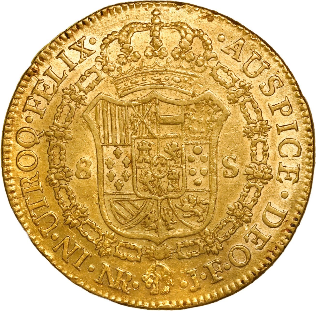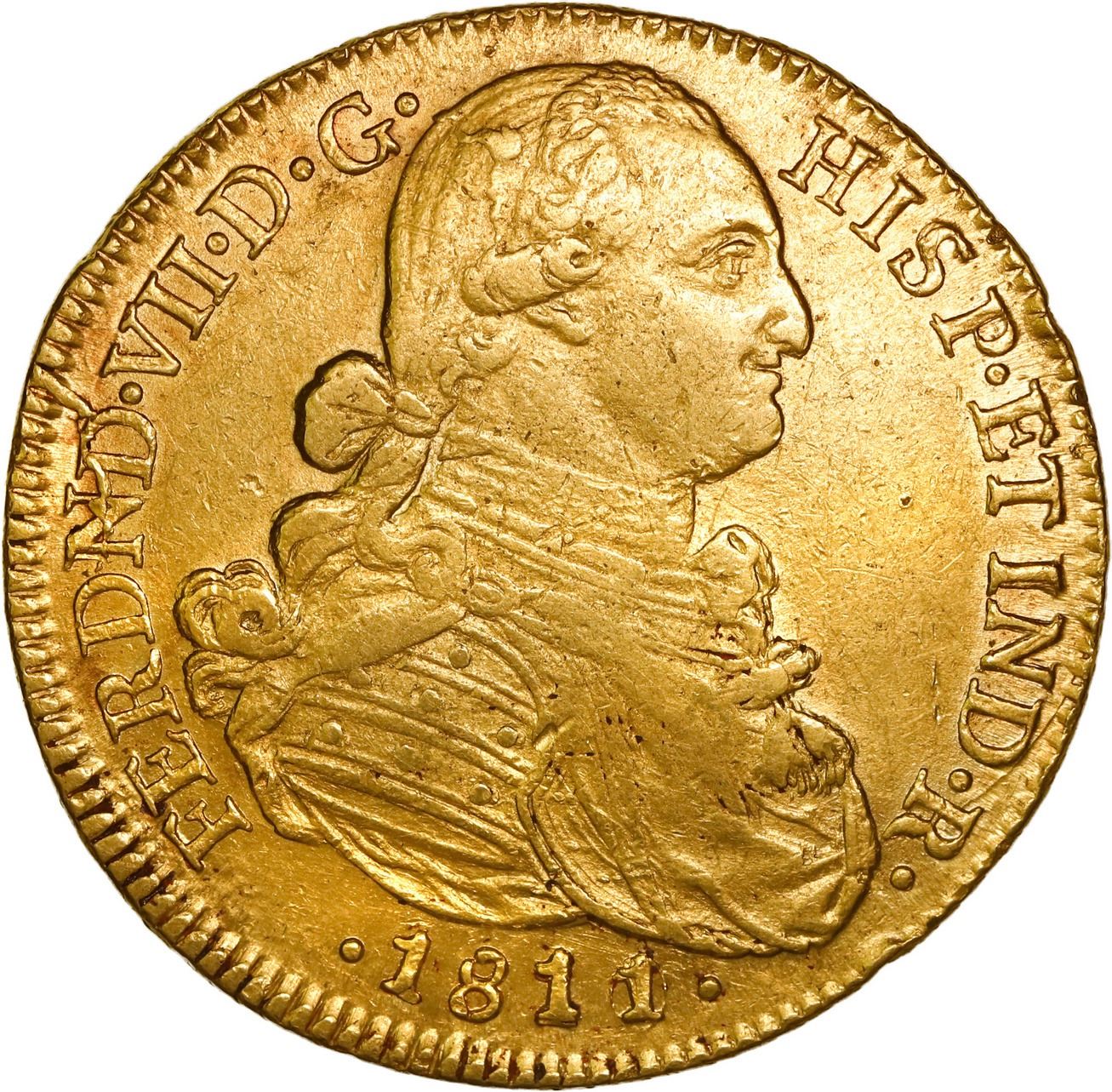 COLOMBIA, Bogotá, gold bust 8 escudos, Ferdinand VII (bust of Charles IV), 1811/0 J•F, ex-JEAS. Restrepo-127.9; KM-66.2; Cal-1838; Fr-60. 26.88 grams. Lustrous AU with light marks and tiny rim-bumps, hairlines in fields. Pedigreed to the JEAS Collection.