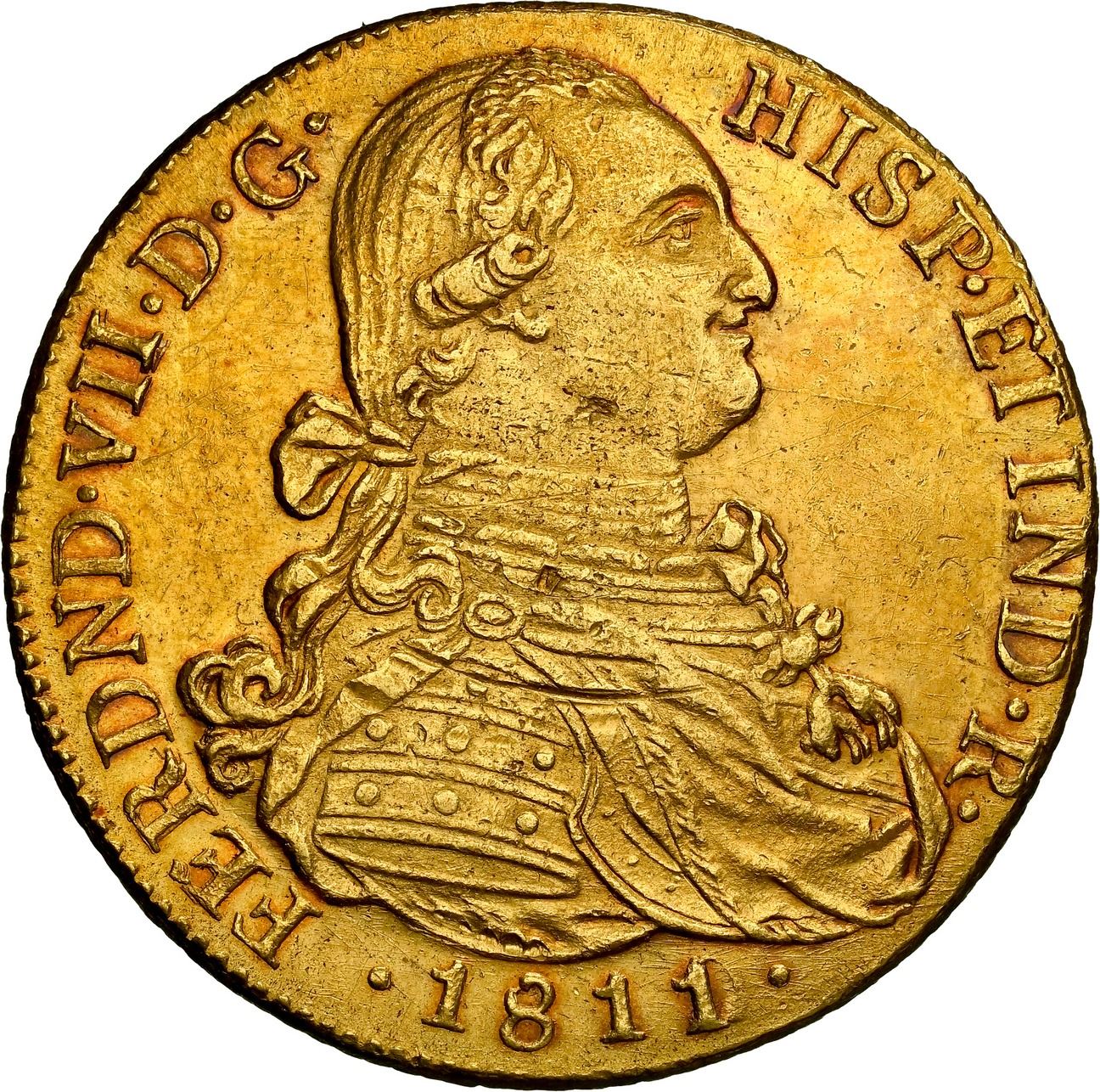 COLOMBIA, Bogotá, gold bust 8 escudos, Ferdinand VII (bust of Charles IV), 1811/0 J•F, no [