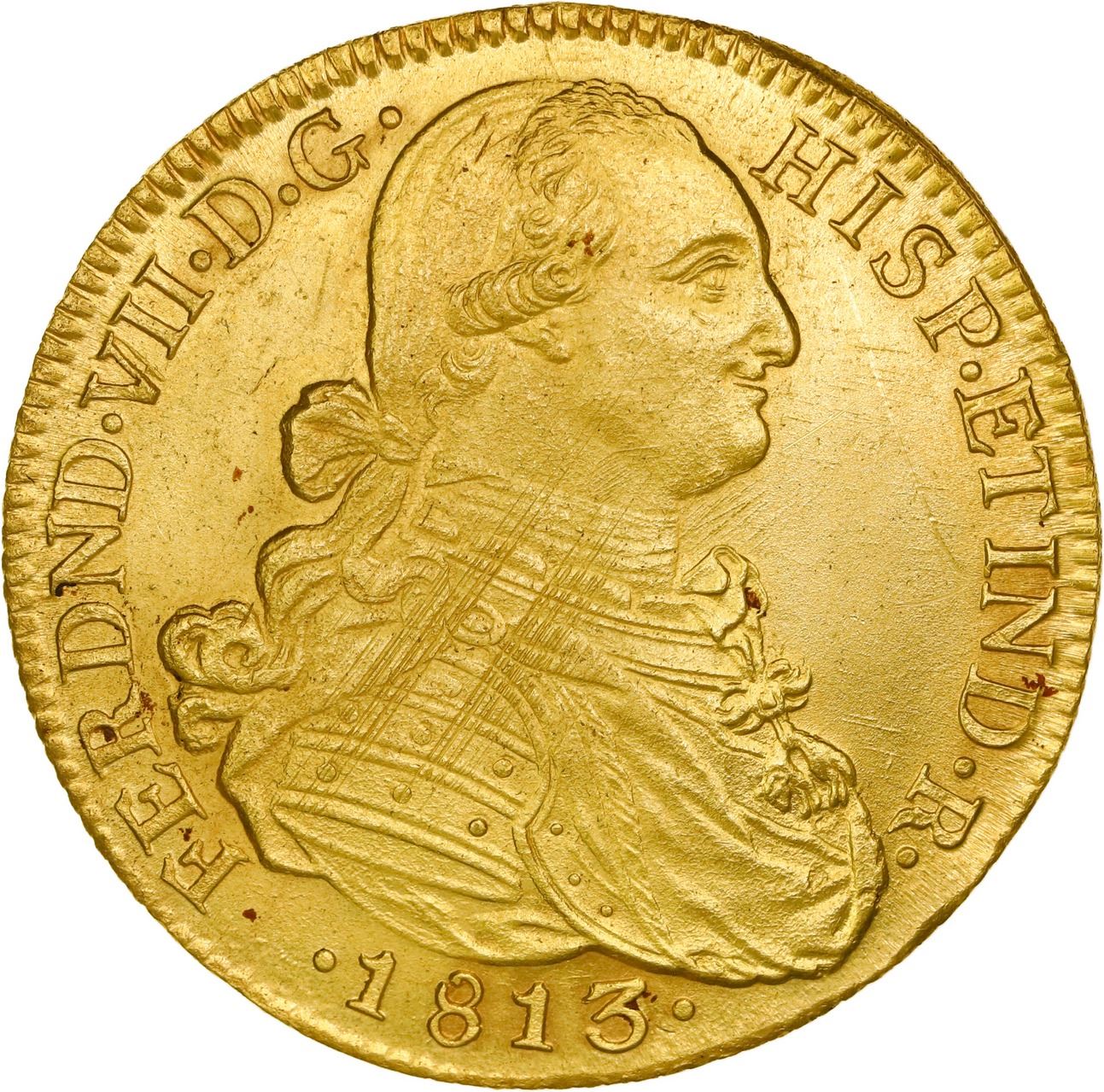 COLOMBIA, Bogotá, gold bust 8 escudos, Ferdinand VII (bust of Charles IV), 1813 J•F, ex-JEA