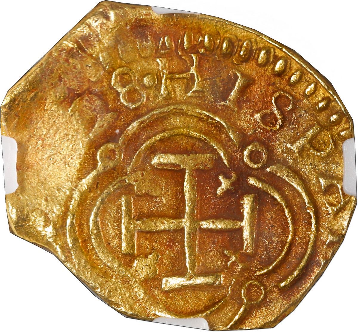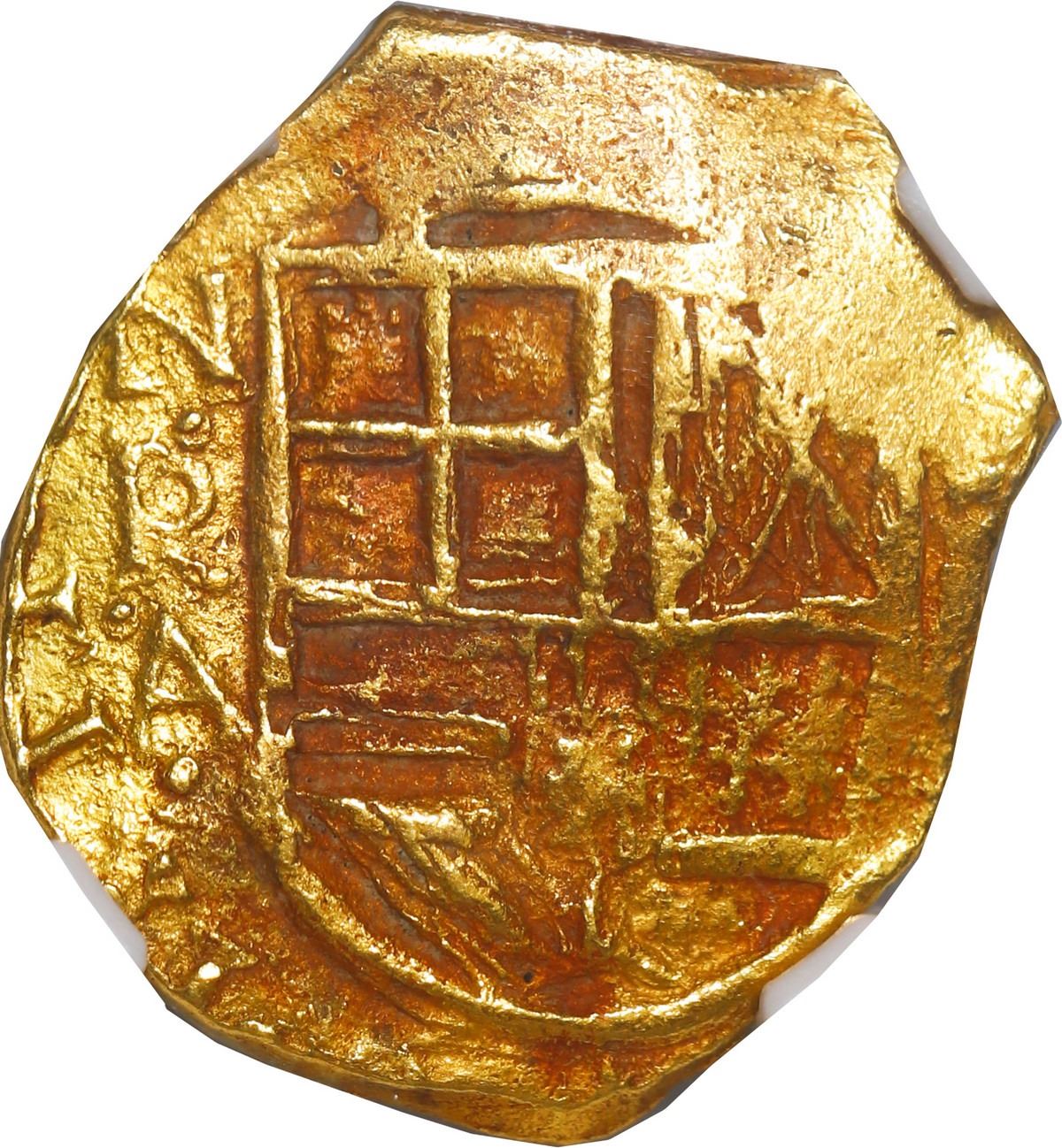 COLOMBIA, Bogotá, gold cob 2 escudos, 1628 (struck in 1633), assayer A below mintmark NR to left, mule, very rare, NGC AU 50 / Mesuno Hoard, ex-Santa Fe, ex-Gray, Sedwick Plate. ANUN-2; Restrepo-M50.3 (this coin); S-B17; KM-unl (cf 4.1); Fr-2. 6.67 grams. Same dies as the previous lot (a very rare muling of a 1628 Pinto 1 escudo reverse with a 1633 Anuncibay obverse, four known), this example with full 28 of date and full NRA above king's ordinal IIII, trace of upright denomination 2 to right, good full shield and cross-and-tressure, the latter in a distinctively early style (like the 1626 Cartagena issues), oblong flan with streaks of reddish-purple toning from its time under the water, desirably pedigreed. From the "Mesuno Hoard" (ca. 1636) and pedigreed to the Santa Fe Collection (Sedwick Auction 10, lot 20), also to the Thomas Gray collection (displayed at the ANA Money Museum's "Treasures of the Deep" exhibit in 2014-15), and Plate Coin in Sedwick's The Practical Book of Cobs, 4th edition (2007), as stated on label.