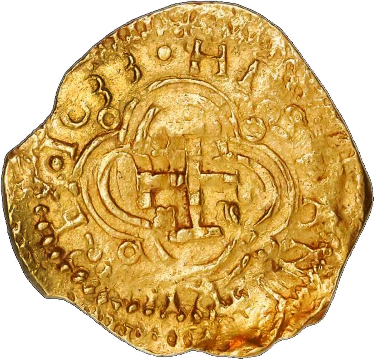 COLOMBIA, Bogotá, gold cob 2 escudos, 1633, assayer A below mintmark NR to left, very rare, NGC MS 63 / Mesuno Hoard, finest known in NGC census, ex-Santa Fe, Restrepo Plate. ANUN-2; Restrepo-M50.11 (this coin); S-B20; KM-4.1; Fr-2. 6.71 grams. Exceptionally broad flan with full inner details (the cross double-struck but same size and style as the 1628 mule issues in the previous two lots, and in fact with the same obverse die) and nearly full legend including complete date, full NRA and denomination II, traces of contrasting red encrustation, desirably pedigreed, one of only two examples known to us. From the "Mesuno hoard" (ca. 1636) and pedigreed to the Santa Fe Collection (Sedwick Auction 11, lot 22), also plated on page 85 of Restrepo's Coins of Colombia (stated on label).