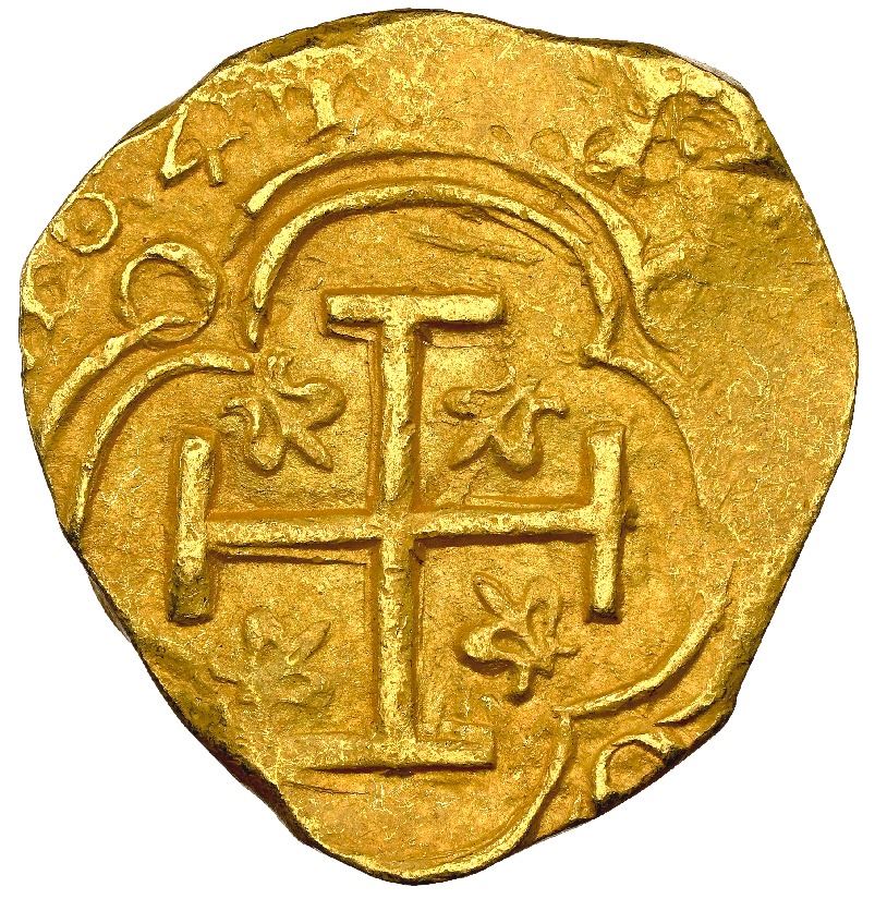 COLOMBIA, Bogotá, gold cob 2 escudos, 1641, assayer A below mintmark NR to left, NGC MS 62, finest known in NGC census. Restrepo-M50.17; S-B20; KM-4.1; Cal-1798; Fr-2. 6.74 grams. Choice full cross (albeit off-center) with clear date 1641 (possibly 1/0) in legend, large ringlets in tressure-dimples unlike other known examples of this date, full but slightly doubled shield with clear mintmark and bold assayer A to left, rich gold color all over.