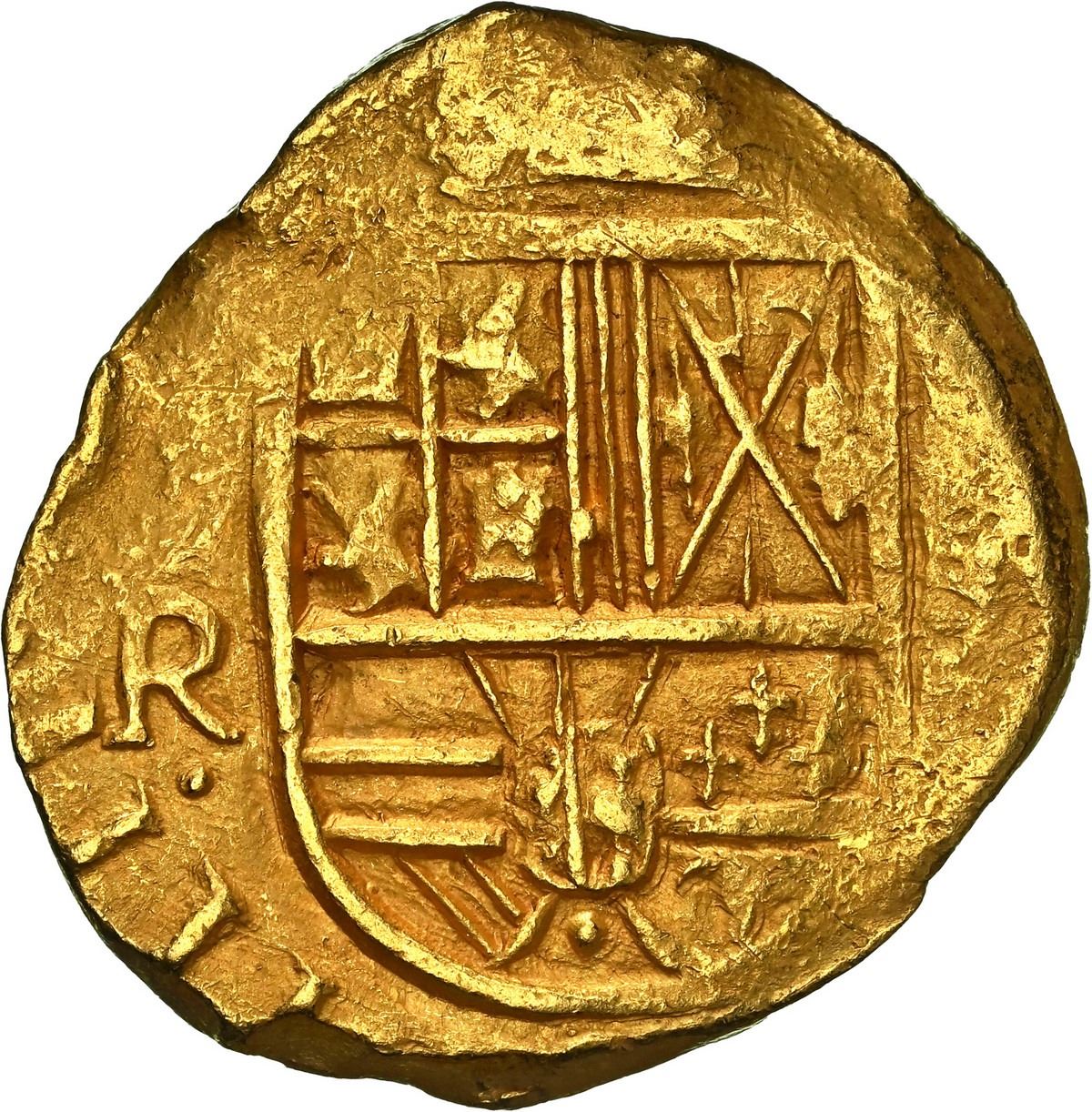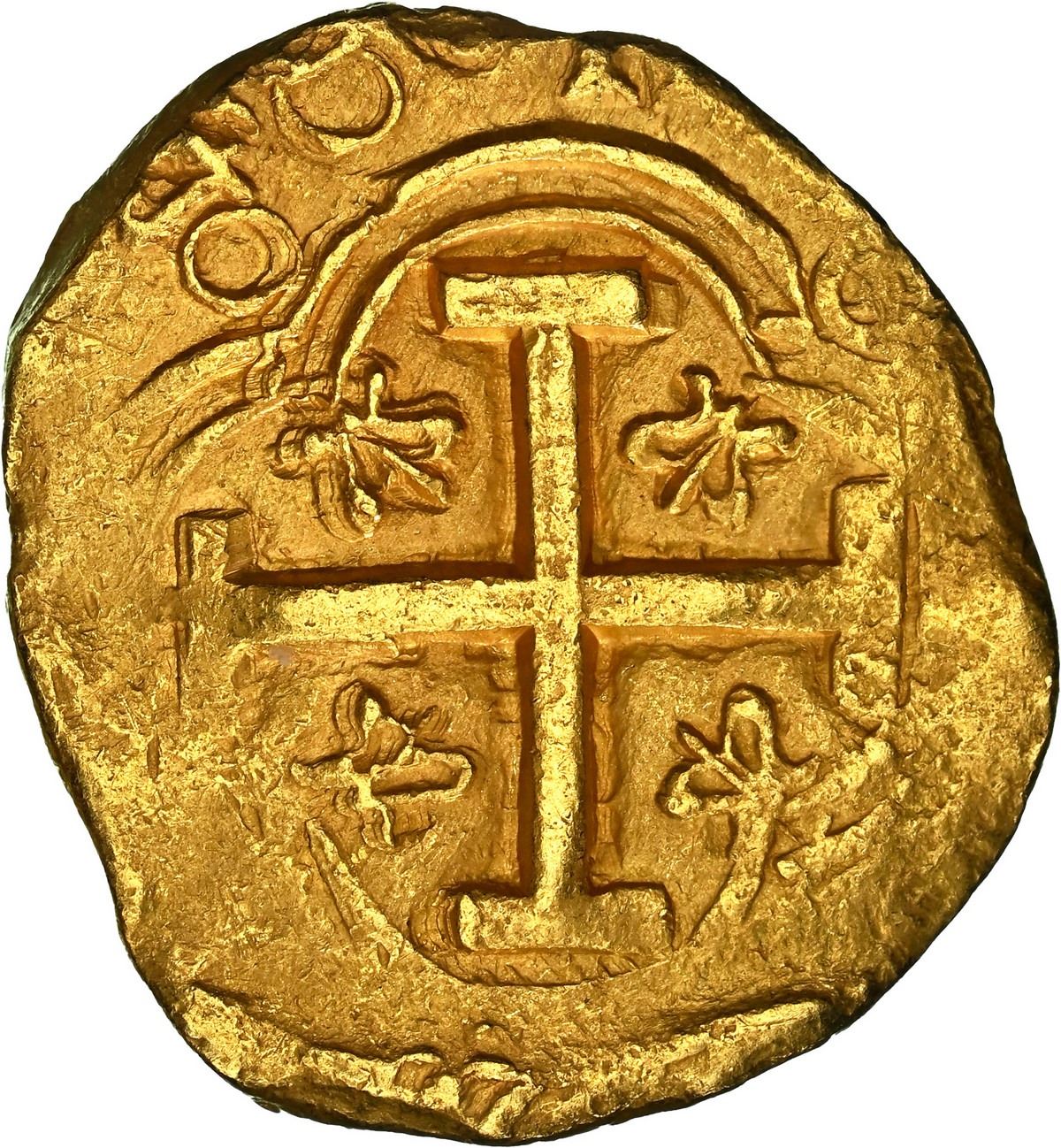 COLOMBIA, Bogotá, gold cob 2 escudos, 1648, assayer not visible (R) to right, mintmark NR to left, rare, NGC MS 62 / Maravillas (Shipwreck Blue Label), finest and only example in NGC census. RAMOS-2; Restrepo-M50.25; S-B21; KM-4.1; Fr-2. 6.78 grams. Choice full cross with bold and clear 48 of date, also choice full shield with bold (N)R to left above king's ordinal IIII (assayer to right not visible but known from die-match with other examples like the next lot), lovely surfaces in rich gold color but with parts of edge slightly crude (as made) due to uneven thickness. From the Maravillas (1656).