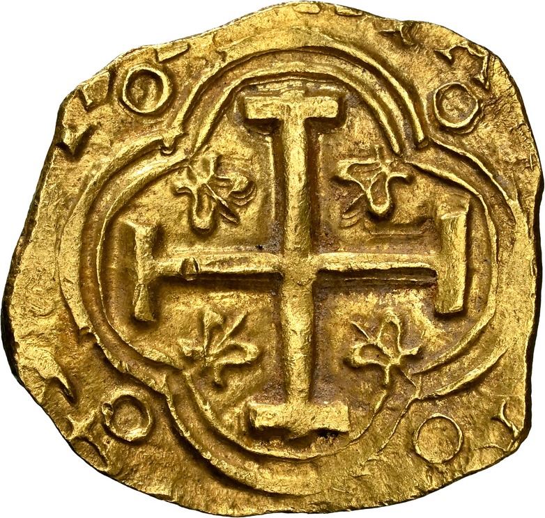 COLOMBIA, Bogotá, gold cob 2 escudos, 1649, assayer R below denomination II to right, mintmark NR to left, rare, NGC MS 62 (Shipwreck Blue Label), finest and only example in NGC census. Restrepo-M50.25; S-B21; Cal-1807; Fr-2; KM-4.1. 6.72 grams. Clear 49 of date (all but the tops of the digits) outside of choice and well-centered full cross-and-tressure, bold •II• and assayer R to right of well-detailed full shield (slightly off-center, the mintmark NR to left off the flan), good luster throughout, a premium piece from a very popular shipwreck and only the third example of this date that we have seen. With certificate. Recovered from: Maravillas, sunk in 1656 off Grand Bahama Island