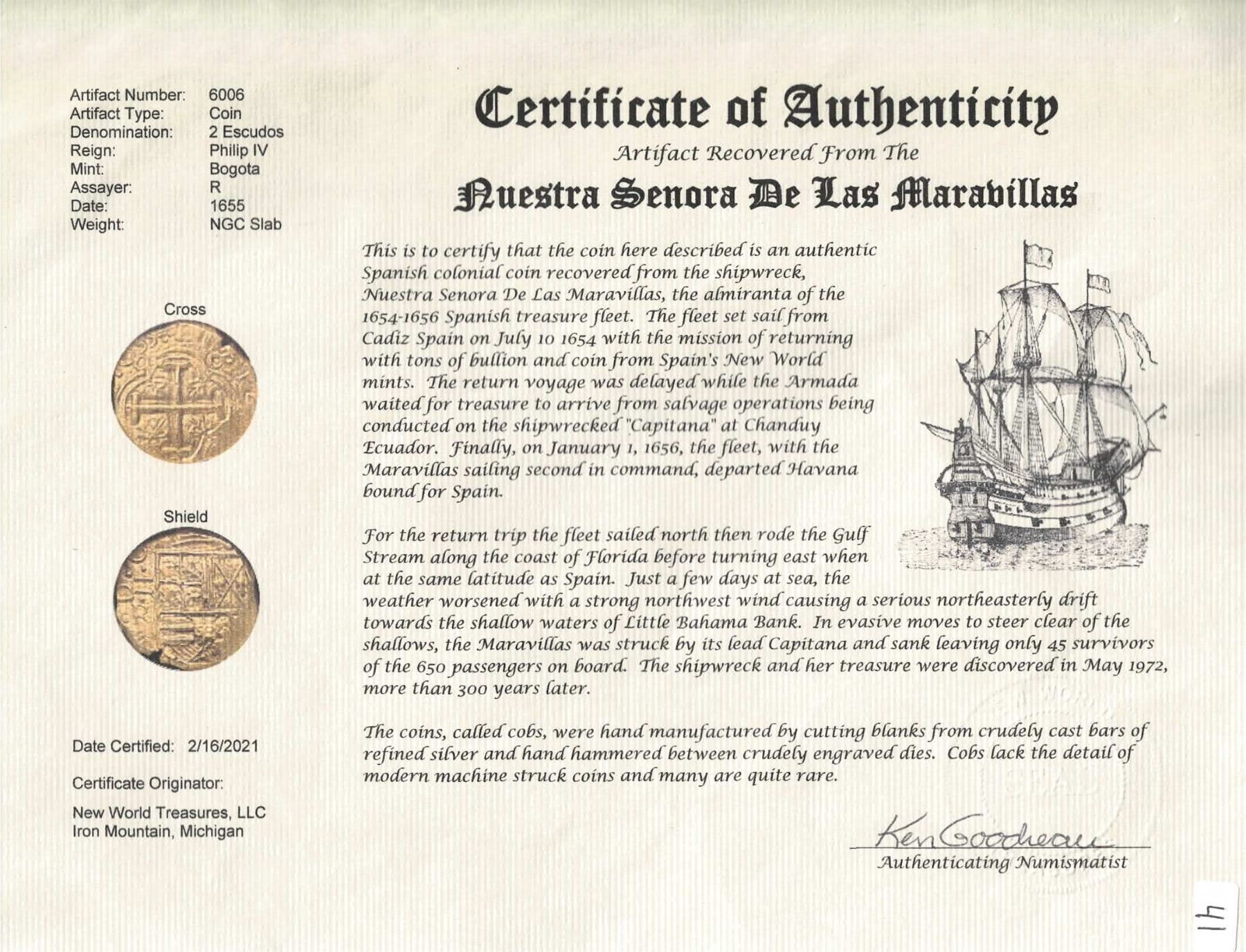 COLOMBIA, Bogotá, gold cob 2 escudos, 1655, assayer R below denomination II to left, mintmark NR to right, NGC MS 63 / Maravillas (Shipwreck Blue Label), finest and only example in NGC census. RAMOS-1; Restrepo-M50.23; S-B21; KM-4.1; Cal-1812; Fr-2. 6.73 grams. Choice full cross with very bold full date followed by cross-of-five-dots ornament, well-detailed full shield with bold full •II•R to left (mintmark to right not visible), lustrous and light in color but with faint contrasting sediment in crevices, a premium coin from this very popular shipwreck. From the Maravillas (1656), with photo-certificate.