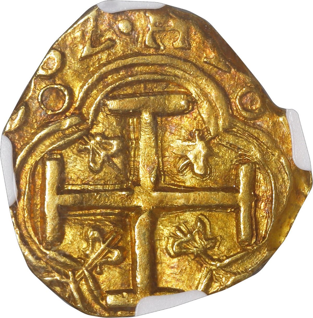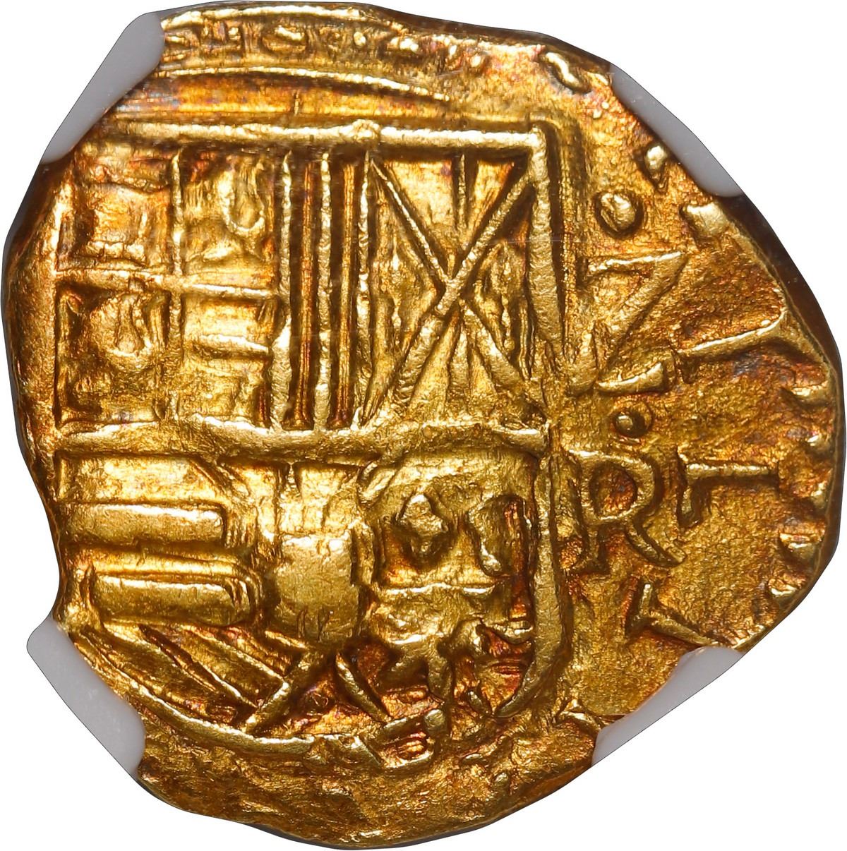 COLOMBIA, Bogotá, gold cob 2 escudos, 1662/1, assayer R below denomination Z to right, very rare, NGC AU 58, finest known in NGC census. RAMOS-5; Restrepo-unl (cf. M50.25); S-B21; Cal-1818; KM-4.1; Fr-2. 6.75 grams. Rich gold color with bright red toning all over, nice full cross and shield (the latter slightly off-center), clear date with full final digit 2 showing trace of under-digit I, full denomination-assayer Z-R to right of shield, the odd denomination actually noted on NGC label (unlisted in Restrepo, only two examples known) distinct from the usual denomination II that is also known for this overdate.