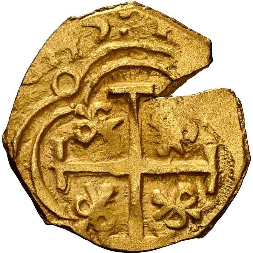 COLOMBIA, Bogotá, gold cob 2 escudos, 1693, assayer not visible (ARCE), PCGS AU55 (1715 Fleet), finest and only example in PCGS census. Restrepo-unl (cf M66.22); S-B24; Cal-unl (Type 151); Fr-4; KM-14.1. 6.68 grams. Full shield (transposed lions and castles) with clear ARC(E) in legend to left preceded by parts of king's name, choice full cross with distinctive style of fleurs, most of 3 of date in legend plus bottoms of 69, rich gold color, large edge-split. From the 1715 Fleet.