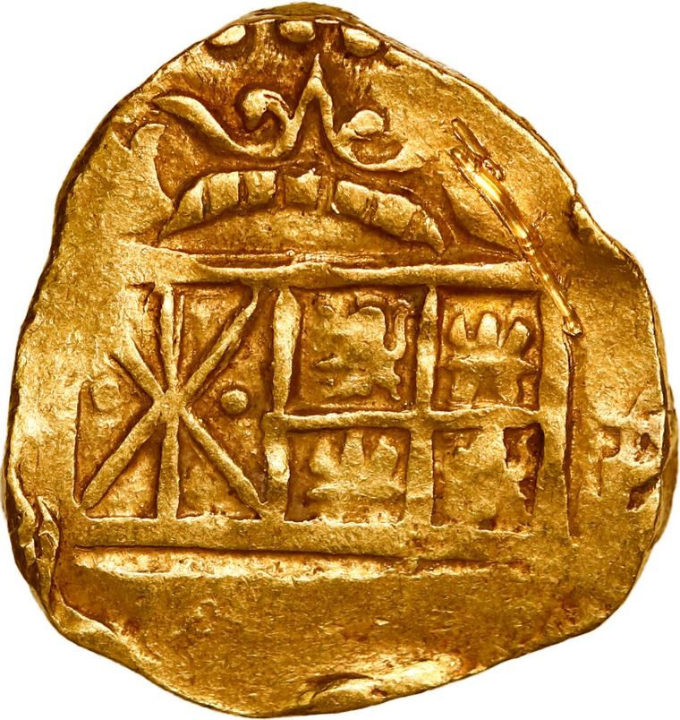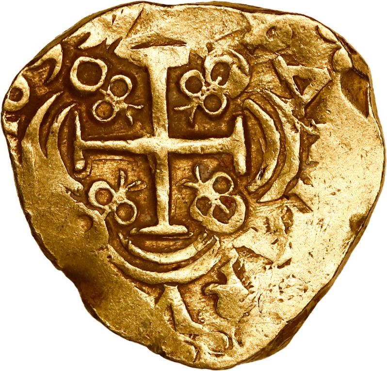COLOMBIA, Bogotá, gold cob 2 escudos, 1699 (ARCE), rare. Restrepo-M66.28; S-B24; KM-14.2; Cal-903; Fr-4. 6.72 grams. Bold AU with choice full cross, clear bottom half of date, off-center obverse showing choice top of shield (upper half transposed) and most of crown, parts of edge slightly crude (as made), light sediment in crevices.