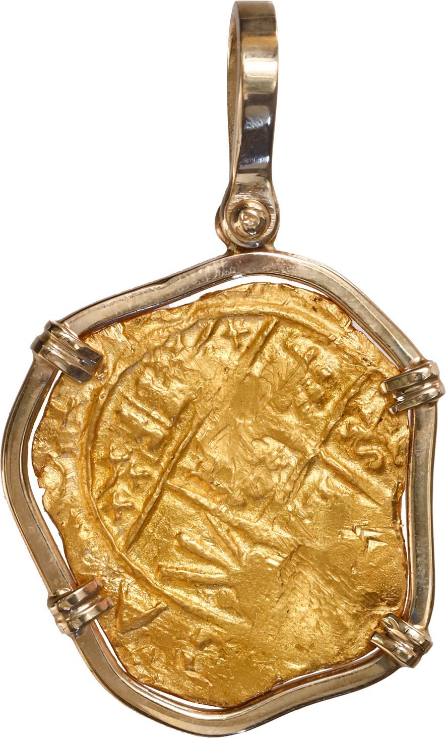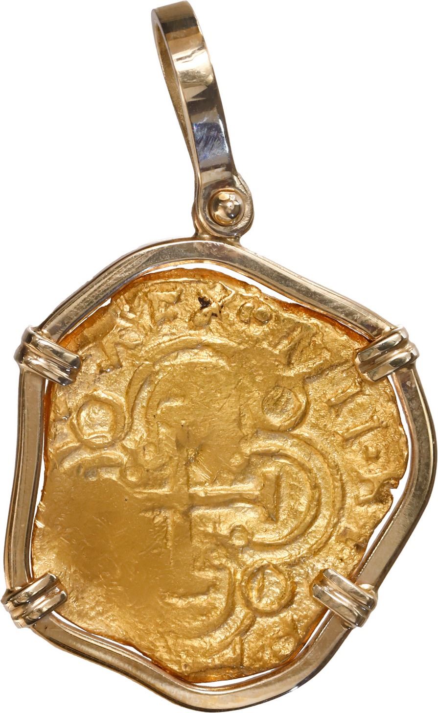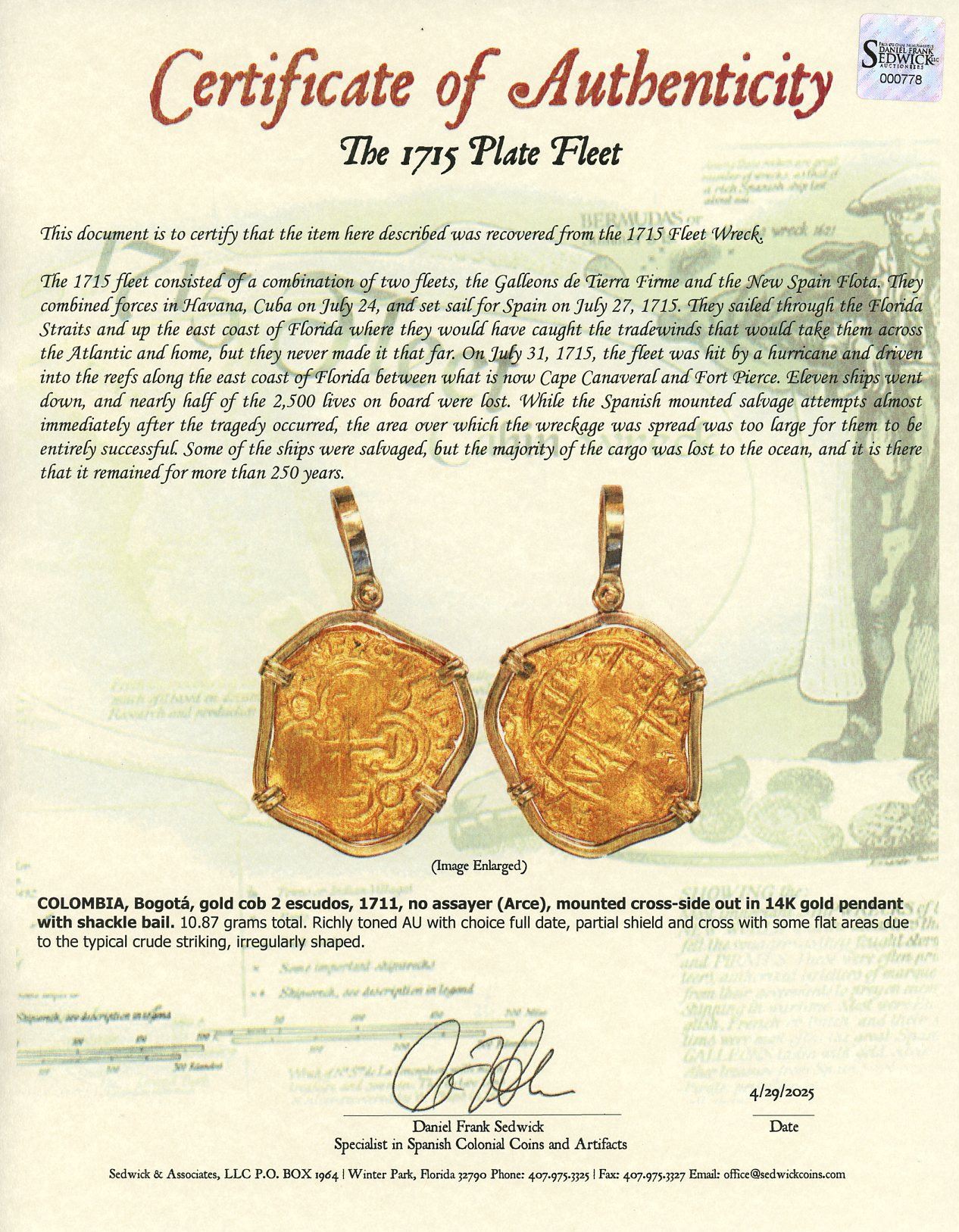 COLOMBIA, Bogotá, gold cob 2 escudos, 1711, no assayer (Arce), ex-1715 Fleet, mounted cross-side out in 14K gold pendant with shackle bail. 10.87 grams total. Richly toned AU with choice full date, partial shield and cross with some flat areas due to the typical crude striking, irregularly shaped. From the 1715 Fleet.