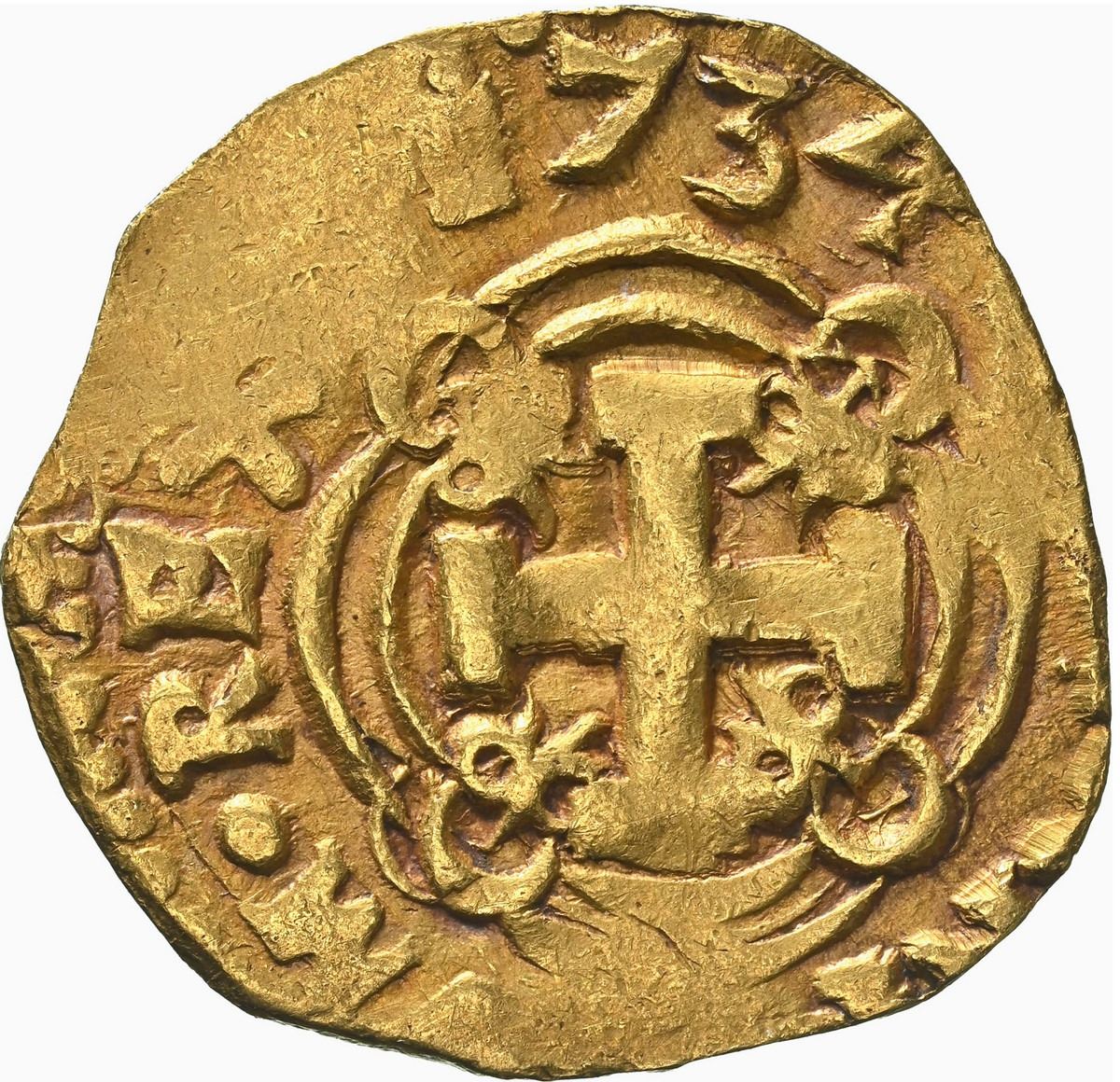 COLOMBIA, Bogotá, gold cob 2 escudos, 1734, assayer M (facing inward) to right, NGC AU 55, Restrepo Plate (stated on label). MOLA-1; Restrepo-M80.12 (this coin); S-B26; Cal-1952; KM-17.2; Fr-8a. 6.72 grams. Very choice full date outside of complete cross-and-tressure with distinctive half ringlets in tressure-dimples, also full but slightly doubled shield (couple flat spots) with bold assayer M (facing inward) inside part of king's name to right, contrastingly toned on fields, second finest in NGC census behind a single MS 62. Plate Coin M80-12 on page 98 of Restrepo's Coins of Colombia (2012).