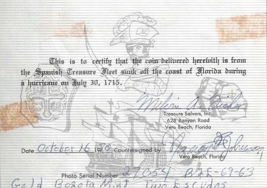 COLOMBIA, Bogotá, gold cob 2 escudos, Charles II posthumous, no assayer (Arce), NGC AU details / scratches (1715 Fleet Shipwreck Label), ex-Fisher (1970). Restrepo-M66.32; S-B24; Cal-Type 242 (under Ph. V); KM-14.2; Fr-4a. Muted luster with coral encrustation in crevices, full cross, doubled shield (style of 1712-13 with large, seated lions in transposed quadrants), with tiny marks from the ocean but also light staple-scratches on reverse, desirable original pedigree. From the 1715 Fleet, with original cardboard holder and (small) certificate 27054 B2E-69-63 from 1970 hand-signed by Mel Fisher.