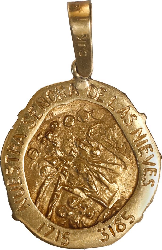 COLOMBIA, Bogotá, gold cob 2 escudos, Charles II posthumous, no assayer (Arce), ex-1715 Fleet, mounted shield-side out in 14K pendant engraved with NUESTRA SENORA DE LAS NIEVES 1715 3185, swivel bail. 8.33 grams total. AU+ with widely doubled design obscuring most of the cross yet shield fairly decent, quite lustrous with rich golden toning on the front, reverse a bit shiny from wear, mounted in a unique pendant setting indicating its recovery from the Nieves site of the 1715 Fleet. From the 1715 Fleet.