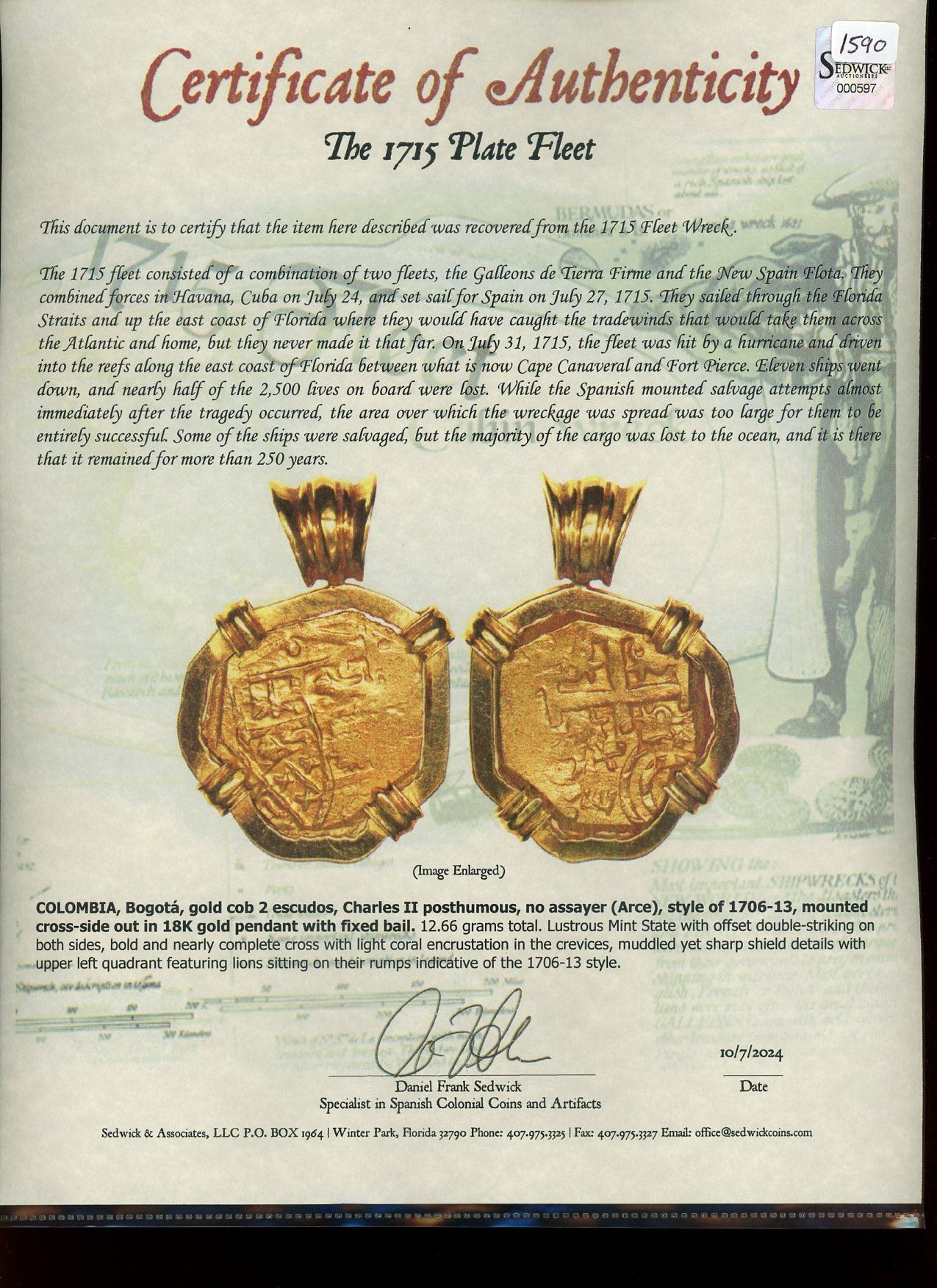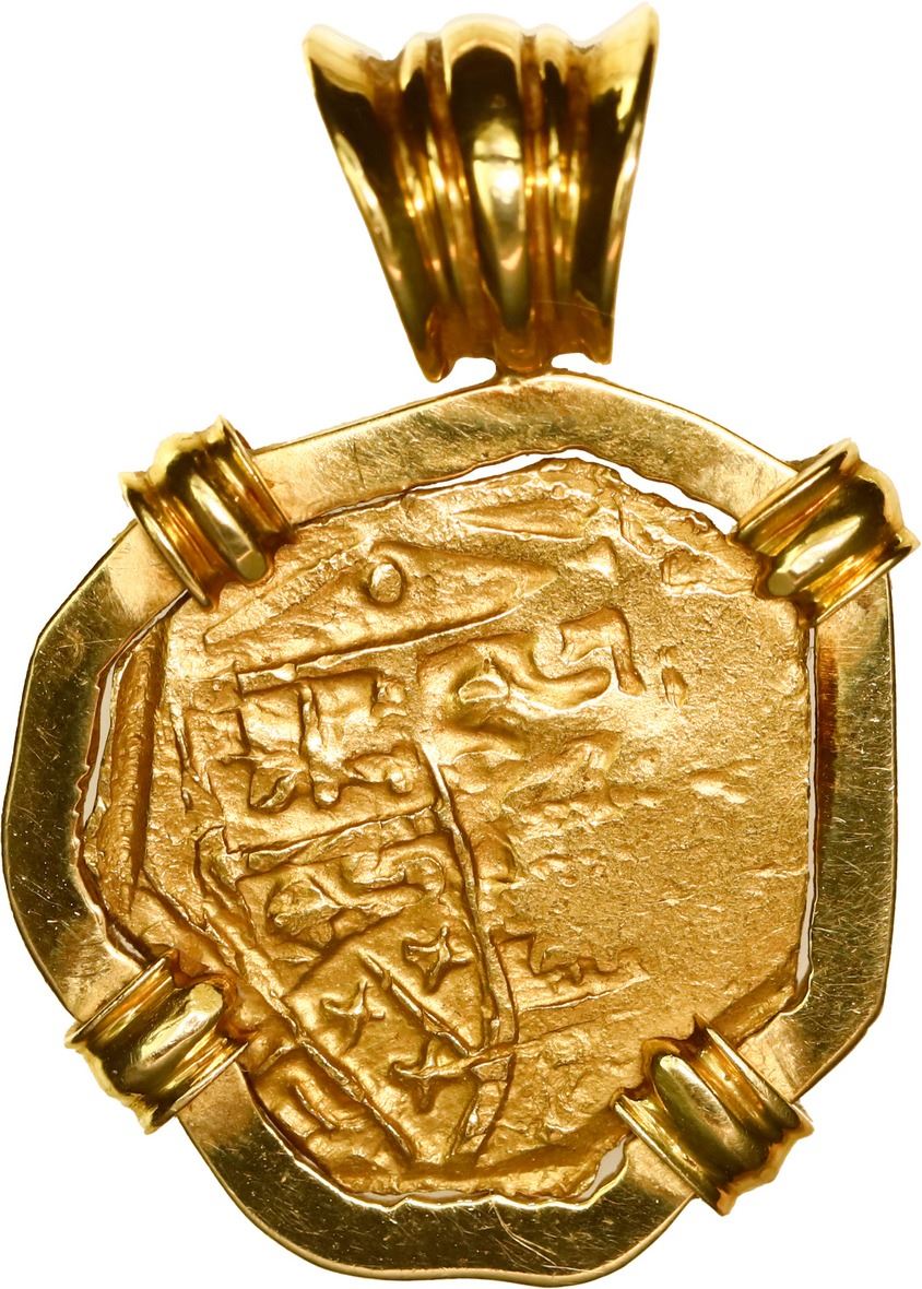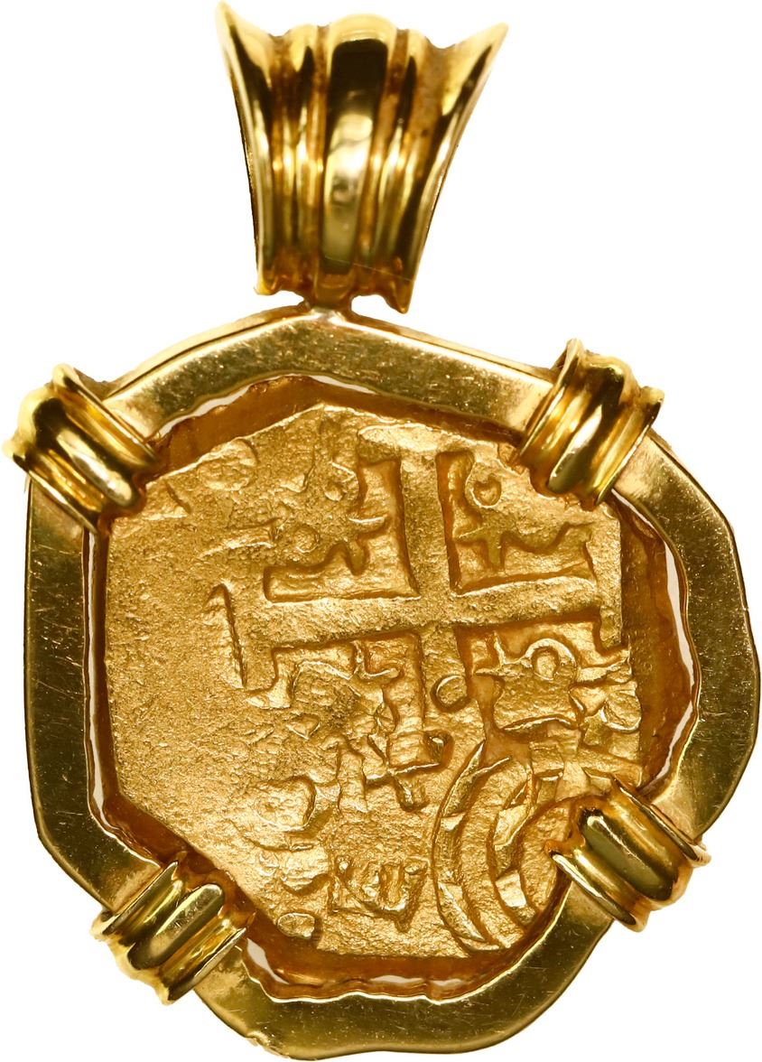 COLOMBIA, Bogotá, gold cob 2 escudos, Charles II posthumous, no assayer (Arce), style of 1706-13, ex-1715 Fleet, mounted cross-side out in 18K gold pendant with fixed bail. 12.66 grams total. Lustrous Mint State with offset double-striking on both sides, bold and nearly complete cross with light coral encrustation in the crevices, muddled yet sharp shield details with upper left quadrant featuring lions sitting on their rumps indicative of the 1706-13 style. From the 1715 Fleet.