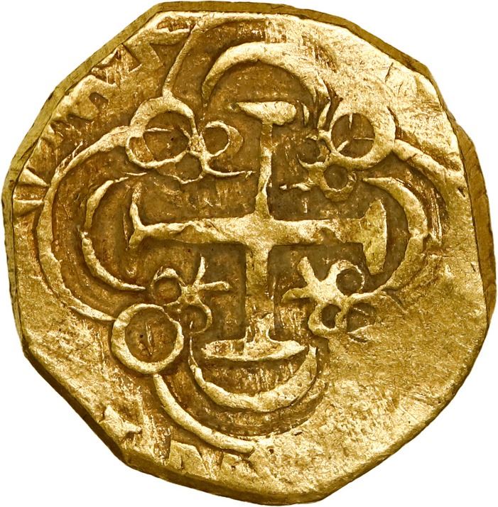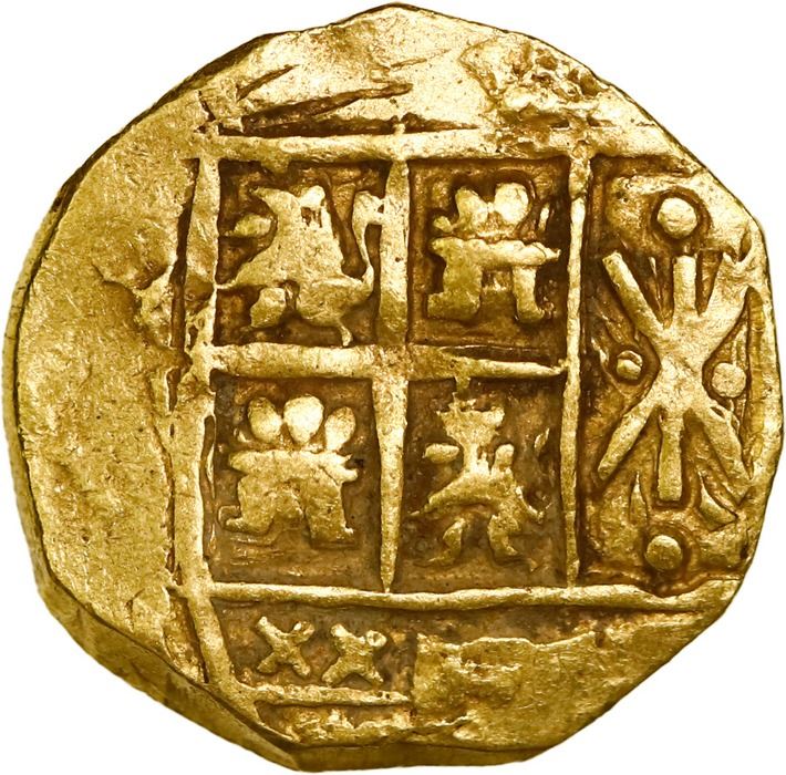 COLOMBIA, Bogotá, gold cob 2 escudos, Charles II posthumous, no assayer (Arce). Restrepo-M66.40; S-B24; KM-14.2; Cal-Type 242 (under Ph. V); Fr-4a. 6.69 grams. AU with nicely struck details including bold partial shield and choice full cross.