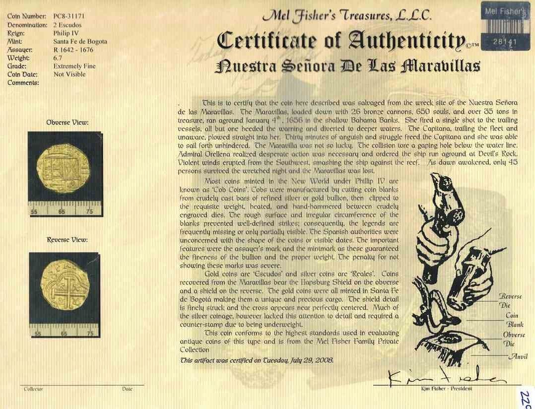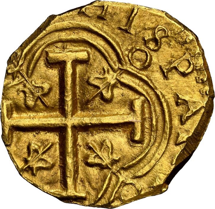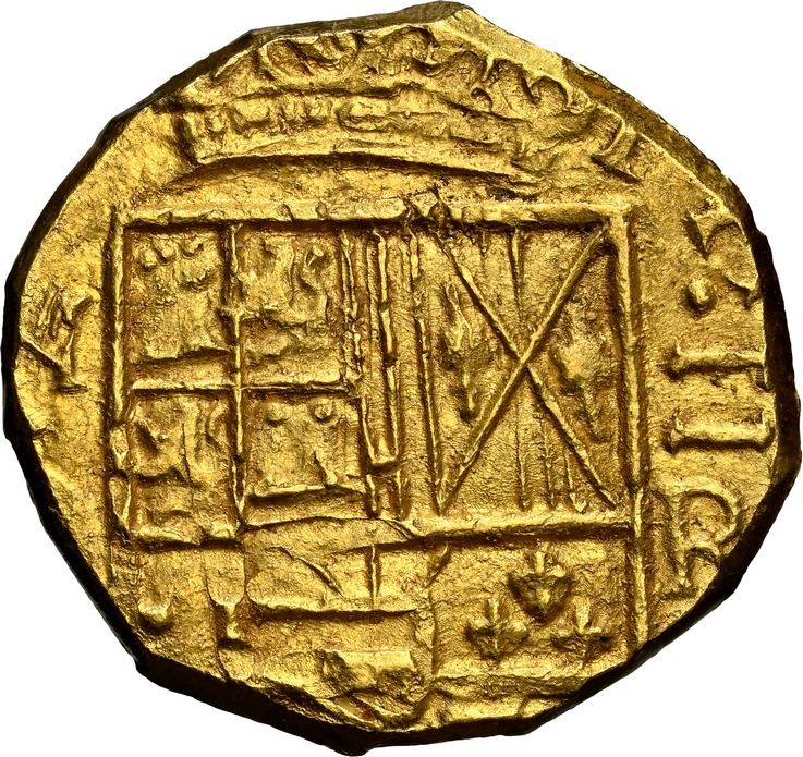 COLOMBIA, Bogotá, gold cob 2 escudos, Philip IV, assayer R below denomination II to right, mintmark NR to left, NGC MS 65 (Shipwreck Blue Label), finest known in NGC census. Restrepo-M50.25; S-B21; Cal-Type 386; Fr-2; KM-4.1. 6.73 grams. Smallish flan with well-detailed full shield and choice but off-center full cross, bold denomination II and assayer R to right, clear N of mintmark to left, all details super sharp and highly lustrous per the exemplary grade (the single finest at NGC for examples of assayer R without visible date). With original Fisher photo-certificate PC8-31171. Recovered from: Maravillas, sunk in 1656 off Grand Bahama Island