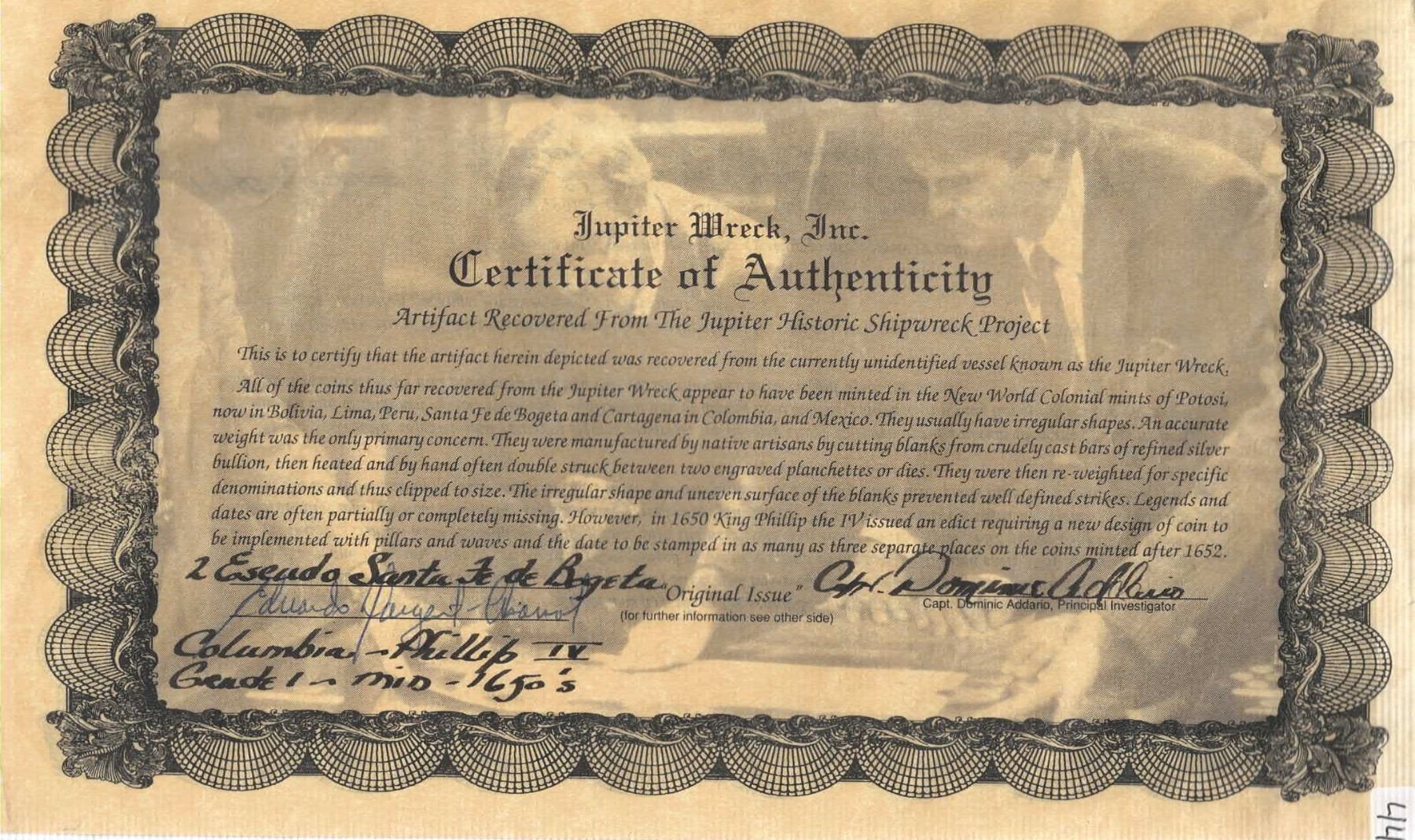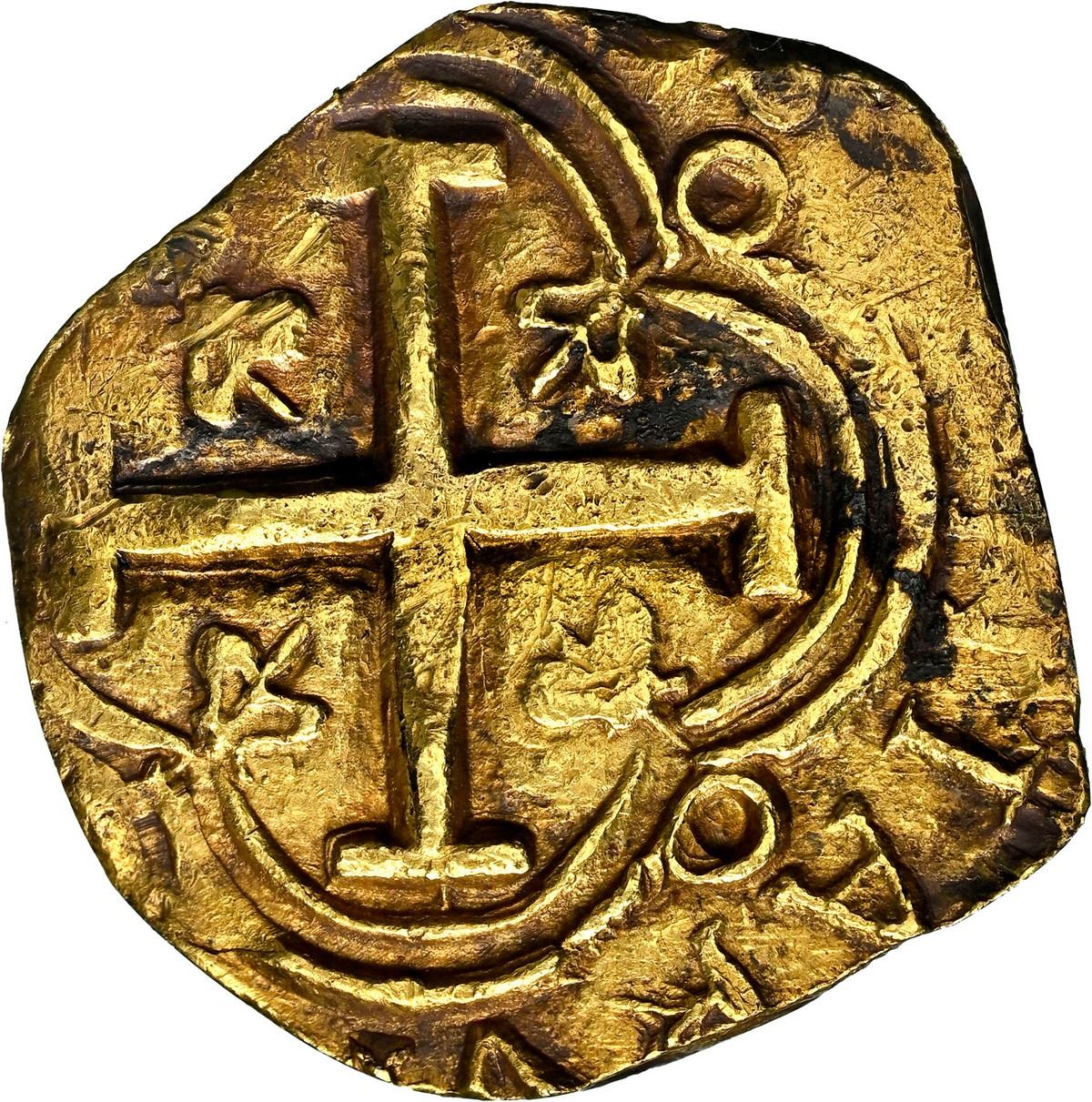 COLOMBIA, Bogotá, gold cob 2 escudos, Philip IV, assayer R below denomination II to right, mintmark NR to left, NGC AU details / removed from jewelry / Jupiter (Shipwreck Blue Label). RAMOS-2; Restrepo-M50.25; S-B21; Cal-Type 386; KM-4.1; Fr-2. 6.68 grams. Cross and shield but full and well detailed but slightly off-center, with choice full crown and clear •II•R to right as a result (assayer not mentioned on label), some dark staining on fields that serves as good contrast, highly desirable as certified from this popular shipwreck. From the “Jupiter Wreck” (San Miguel Arcángel, 1659, with original certificate from the salvors signed by Eduardo Dargent-Chamot and pedigreed to the Thomas Gray collection and formerly displayed at the ANA Money Museum's "Treasures of the Deep" exhibit (2014-15), also pedigreed to our Auction #10, lot #33.