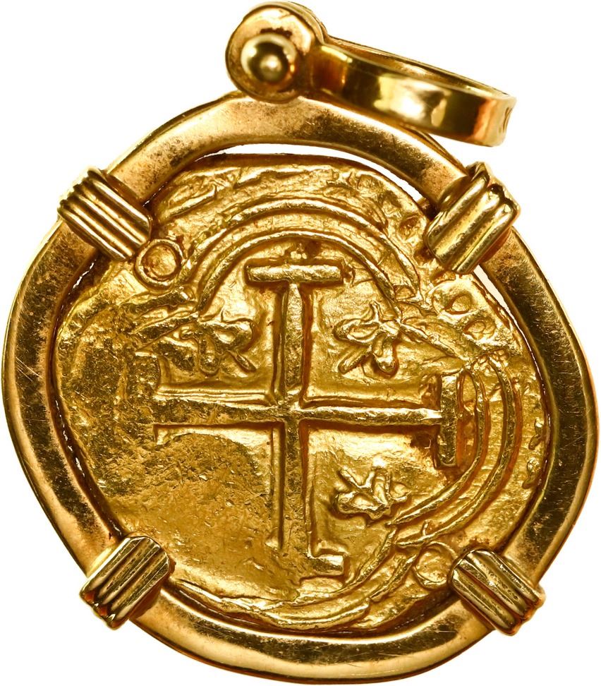 COLOMBIA, Bogotá, gold cob 2 escudos, Philip IV, assayer R to right, ex-Maravillas (1656), mounted cross-side out in 18K gold pendant with shackle bail. 10.97 grams total. Lustrous piece with nice full cross and sharp, nearly complete shield with bold assayer, richly golden toned fields providing a nice contrast with the design. From the Maravillas (1656).