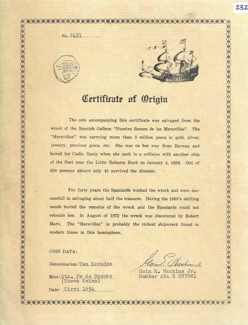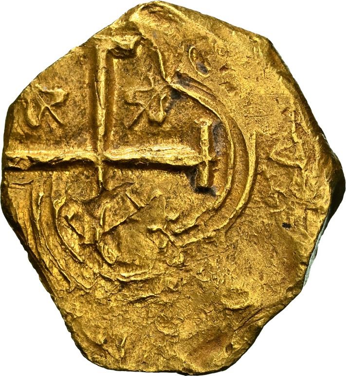 COLOMBIA, Bogotá, gold cob 2 escudos, Philip IV, assayer not visible (R) below denomination II to left, mintmark NR to right, NGC MS 61, ex-Haskins. Restrepo-M50.23; S-B21; Cal-Type 386; Fr-2; KM-4.1. 6.71 grams. Off-center shield and cross and somewhat crude edge due to uneven thickness, bold denomination II to left (different from the previous lots and by our records attributable to the dates 1654-55 or prior to 1648). With original certificate 2451 signed by Jack Haskins. Recovered from: Maravillas, sunk in 1656 off Grand Bahama Island