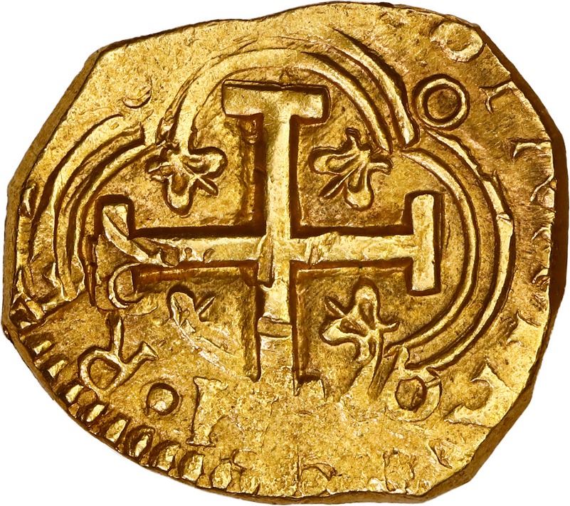 COLOMBIA, Bogotá, gold cob 2 escudos, Philip IV, assayer not visible (R) below denomination II to right, mintmark NR to left, NGC MS 62 (Shipwreck Blue Label). Restrepo-M50.25; S-B21; Cal-Type 386; Fr-2; KM-4.1. 6.76 grams. Very sharp full shield, good full cross (both sides with some inoffensive doubling), parts of legend visible, style of late 1640s to mid-1650s. Recovered from: Maravillas, sunk in 1656 off Grand Bahama Island