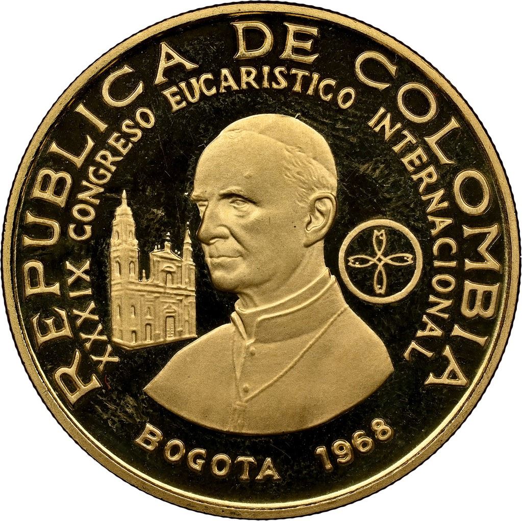 COLOMBIA, Bogotá, gold proof 300 pesos, 1968-B, Eucharistic Congress, NGC PF 68 Ultra Cameo (Colección Val y Mexía Label). Restrepo-p. 264; Sed-59; Fr-119; KM-233. Typical mirrored proof with only the slightest evidence of contact, AGW 0.3733 oz. Pedigreed to the Val y Mexía Collection.
