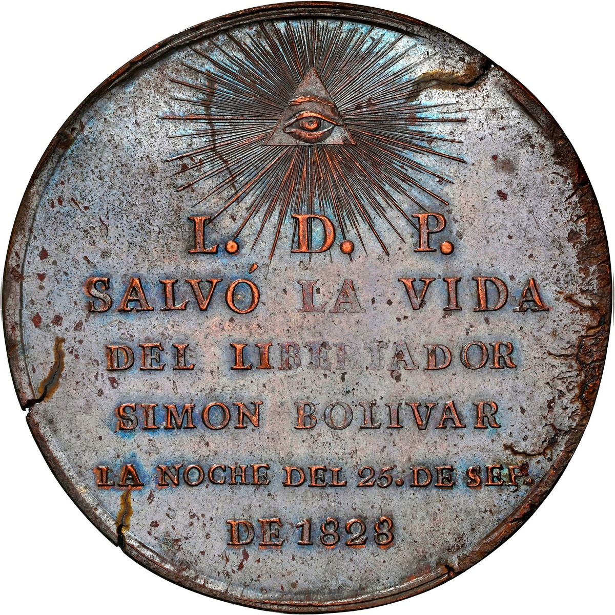 COLOMBIA, Bogotá, large copper medal, dated 1828 (struck 1829), Bolívar saved from assassination, un