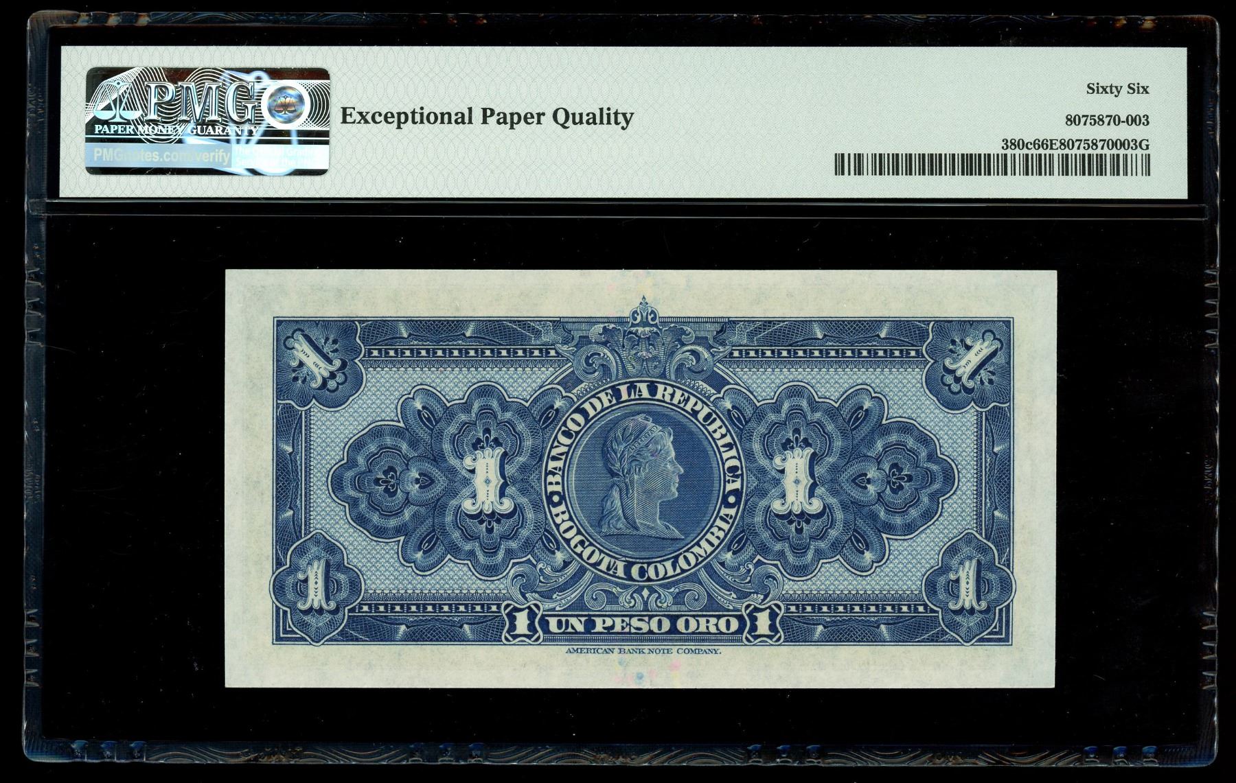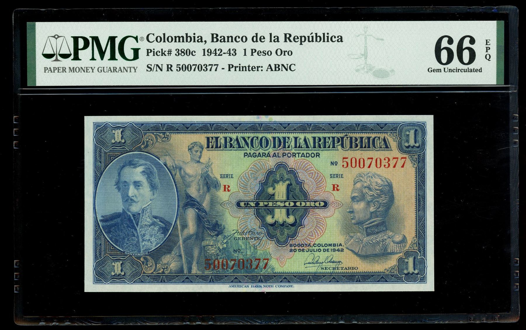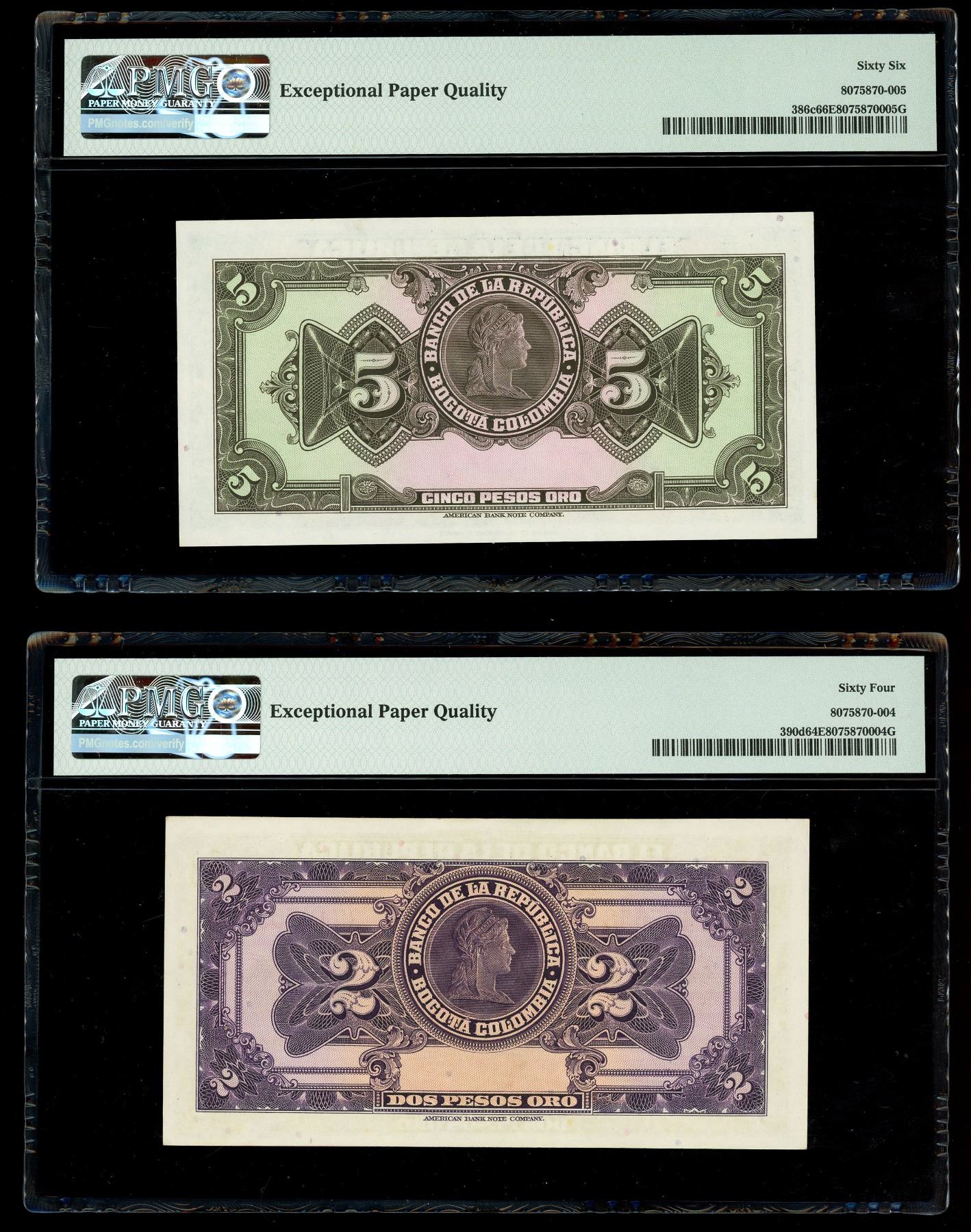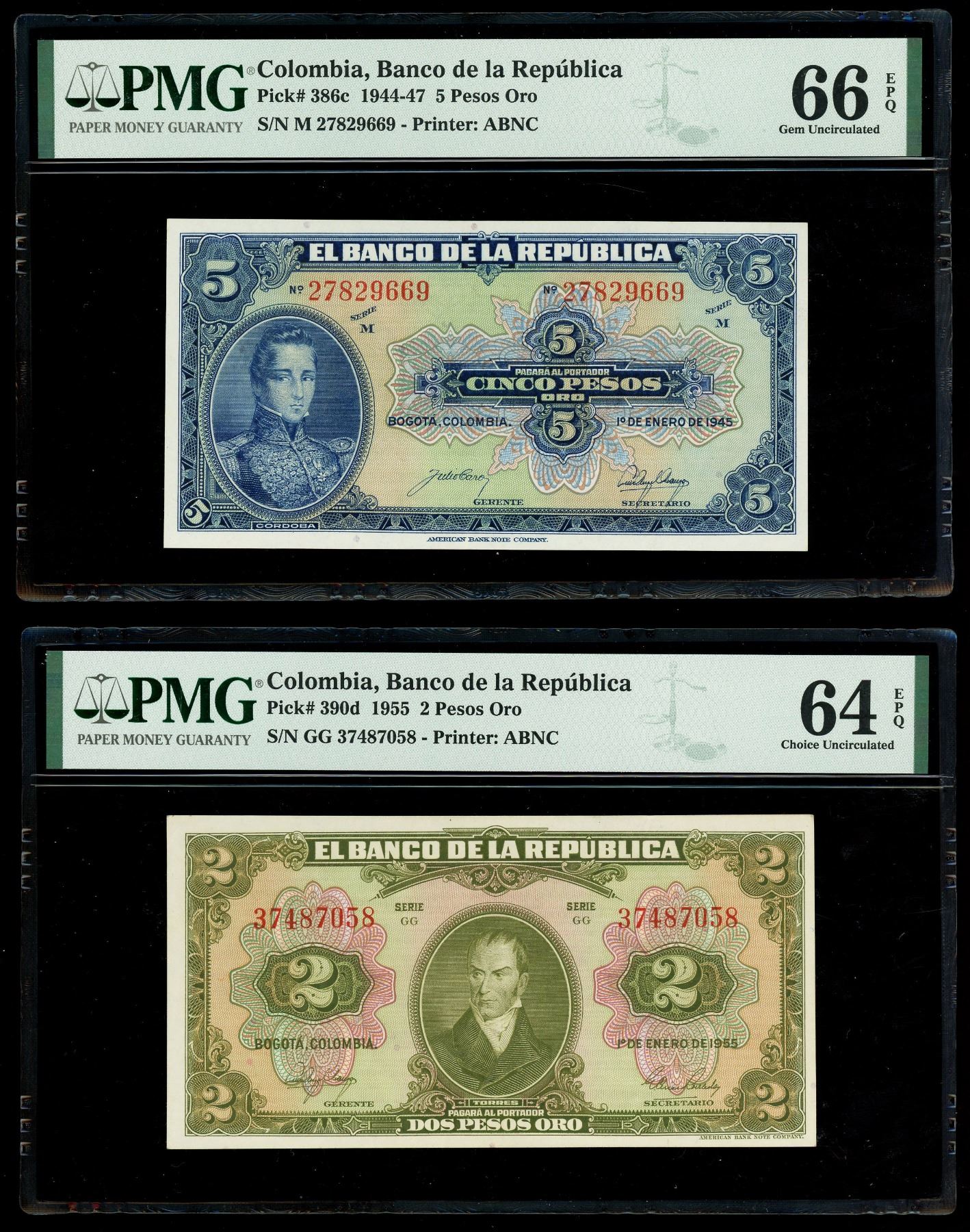 COLOMBIA, Bogotá, lot of three Banco de la República notes: 5 pesos oro, 1945, PMG Gem UNC 66 EPQ; 2 pesos oro, 1955, PMG Choice UNC 64 EPQ; 1 peso oro, 1942, PMG Gem UNC 66 EPQ. Pick-386c, 390d, 380c. Nice group of three colorful Colombian notes with two Gems and one Choice UNC.