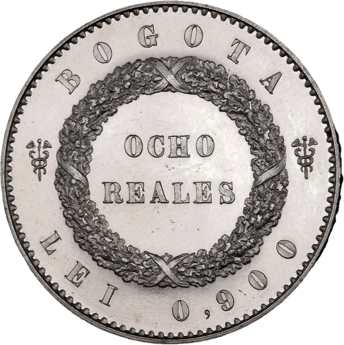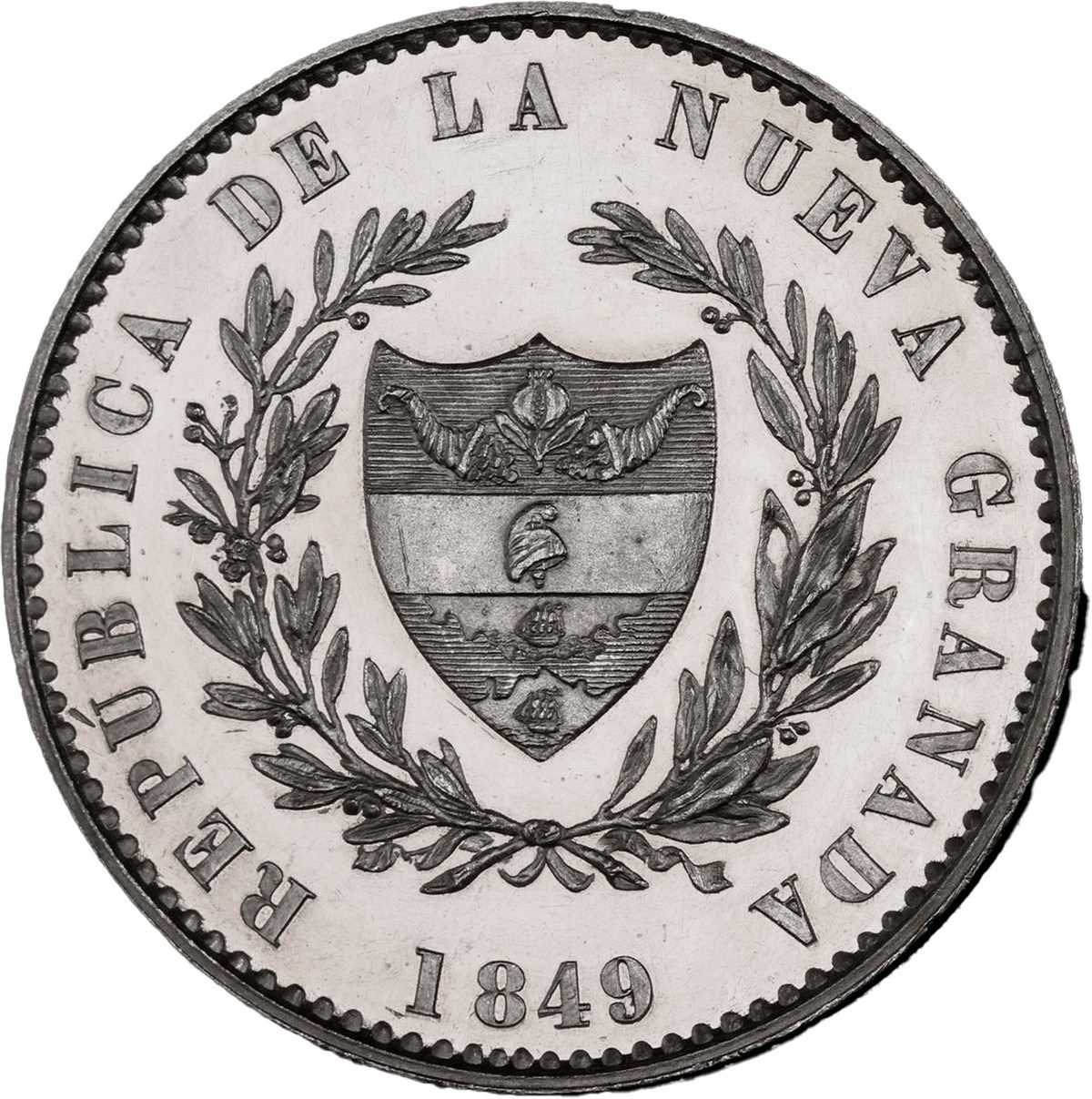 COLOMBIA, Bogotá, pattern 8 reales, 1849, plain edge, rare, PCGS SP62, ex-Eldorado. Restrepo-P62 var; KM-Pn21. Proof-quality mirror luster with light surface hairlines, faint incipient toning at rims, minimal marks, unlisted variant without lettering on edge, unadopted design, eye-catchingly flashy. Pedigreed to the Eldorado Collection (Stack's Bowers auction of August 2018, lot 42150).