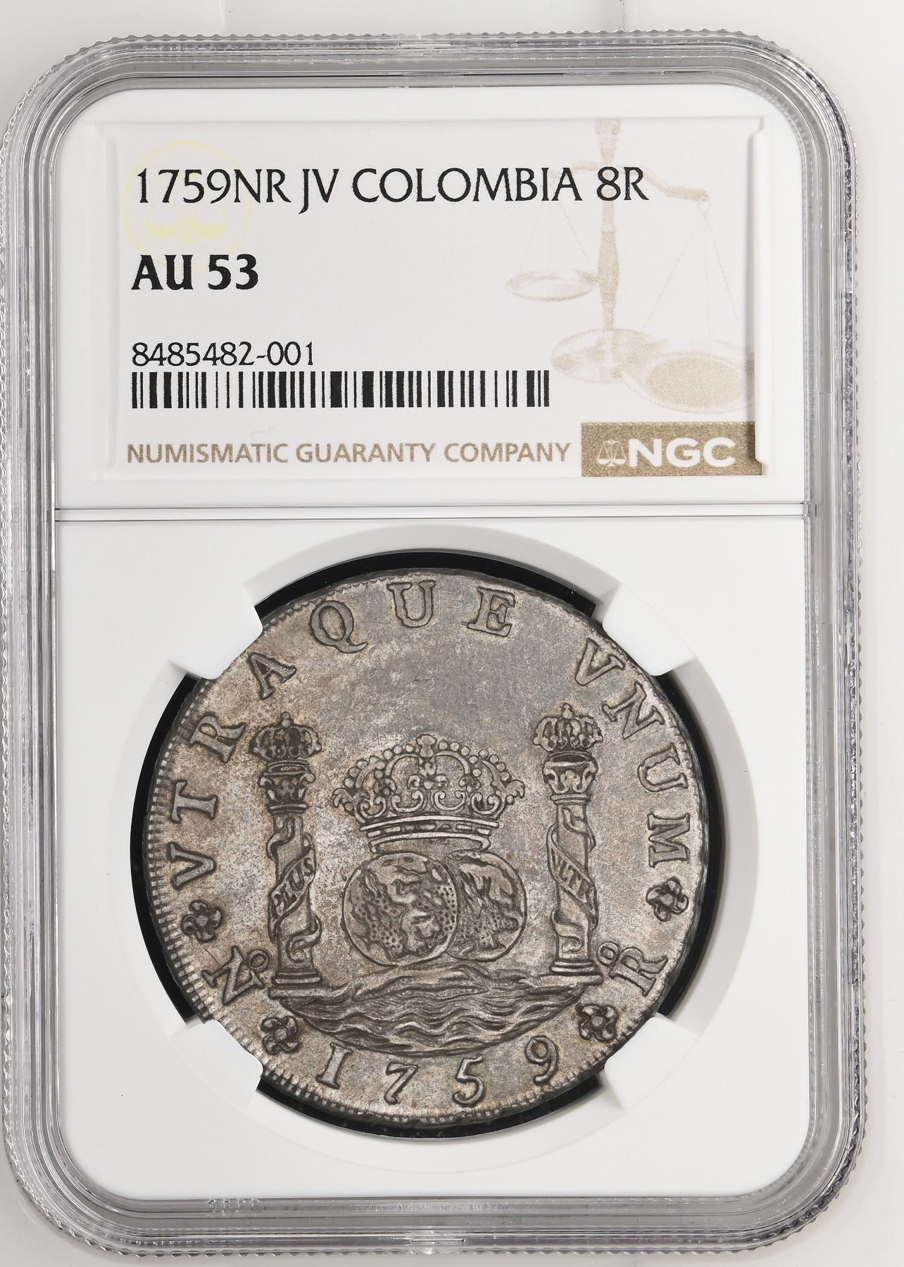 COLOMBIA, Bogotá, pillar 8 reales, Ferdinand VI, 1759 JV, very rare, NGC AU 53, ex-Patterson (cover). Restrepo-10.1; Cal-539; KM-33; Yonaka-B8.59. Rich, original, steely blue-gray toning over lustrous surfaces offering exceptional eye appeal for the type, a perfect combination of rarity and quality, with well-detailed pillars-and-globes and crowned arms showing no weakness anywhere but with distinctive planchet flaw over the E in FERDND, giving this example a unique identity among the very few known survivors. Extremely rare as the first year of Colombian pillar dollars and the only issue under Ferdinand VI. By royal order of 1751, the Nuevo Reino (Bogotá) mint of the Viceroyalty of New Granada was incorporated into the Royal Treasury and directed to adopt the pillar-type coinage with mintmark NR, issued under assayers Joaquín Burgos and Victoriano del Valle. Implementation took years, however, and the dollar-sized coins were not struck until 1759. Restrepo estimates that fifteen examples exist, but only about half of those have hit the market in recent decades, all highly prized as among the rarest and most important coins of the Colombian colonial series. The present lot is a magnificent example of the first Colombian pillar dollar, and a major opportunity to acquire a cornerstone of Spanish-American numismatics. Pedigreed to the Alexander Patterson Collection (Bonham's auction of July 1996, lot 296, pictured on the back cover of the catalog) and to the Ponterio auction of January 2004 (lot 1634).