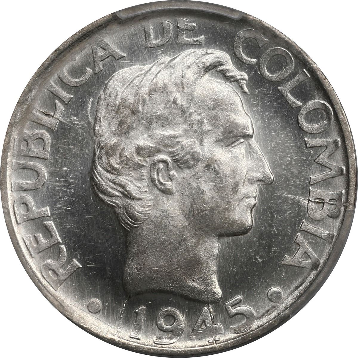 COLOMBIA, Bogotá, proof pattern 20 centavos in .900 silver, 1945-B, rare, PCGS MS65. Restrepo-P164; KM-unl (208.1 for regular issue). Frosty details against mirror-proof fields, a couple tiny spots of reddish toning and several die cracks as seen on others, XRF tested as high silver as opposed to the regular circulation issue in 0.500. (Note: Neither NGC nor PCGS currently recognize this issue as being different from the non-proof issue in 0.500 silver, so it impossible to gauge census rankings).