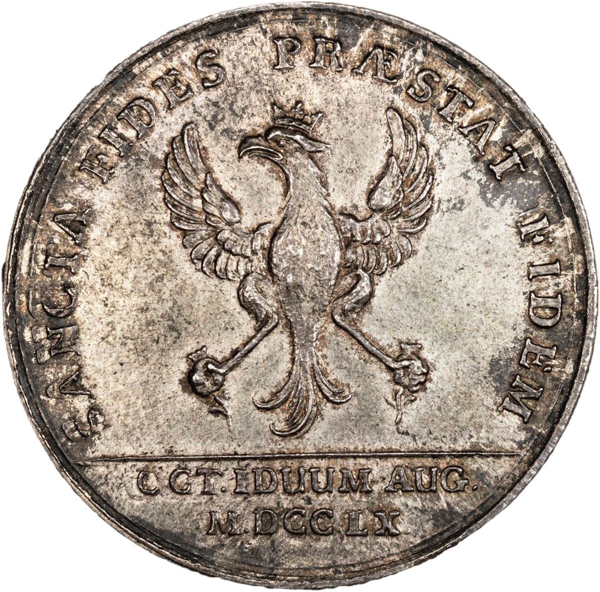 COLOMBIA, Bogotá, uniface trial strike of reverse of 4 reales-sized proclamation medal, Charles III, 1760, rare, PCGS MS62, finest and only example in PCGS census, ex-Santander, Restrepo Plate. Restrepo-8 (p. 111, this piece); Herrera-94; Medina-110; Betts-492. 19.00 grams. 35 mm. Design of crowned eagle facing left with wings spread within legend SANCTA FIDES PRAESTAT FIDEM, with OCT. IDUUM AUG. / M.DCC.LX. in exergue. Deeply toned over nice luster, very important as no actual 4 reales were struck in Colombia under Charles III. Pedigreed to the Santander Collection (Sedwick Auction 26, lot 1136), and plated on page 111 of Restrepo's Coins of Colombia (2012), stated on label.