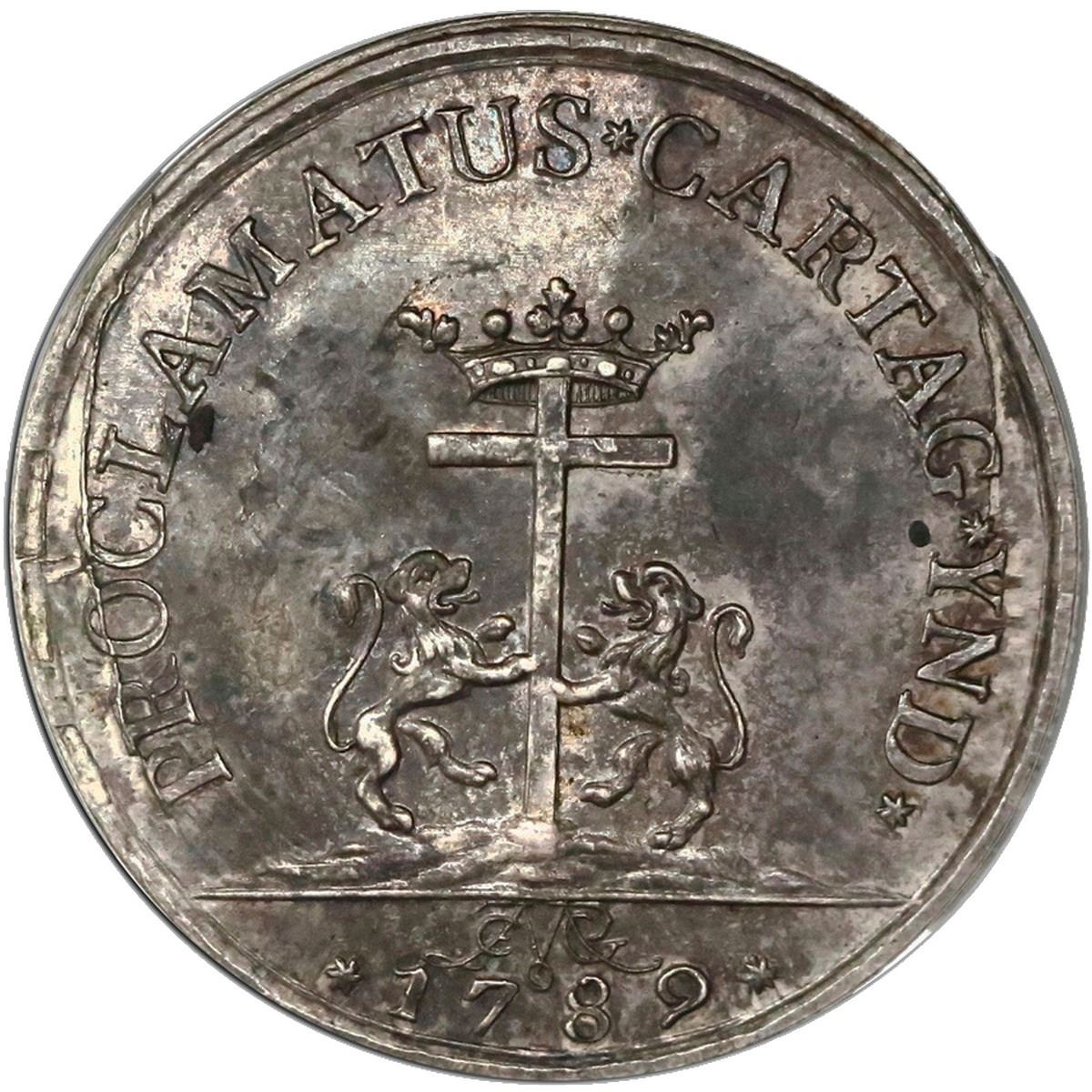 COLOMBIA, Cartagena, 4 reales-sized proclamation medal, Charles IV (bust of Charles III), 1789, coin axis, very rare, NGC AU 58, "top pop," ex-Santander. Restrepo-p. 121; Herrera-126; Medina-138. 33 mm. Obverse with armored bust of Charles III [sic] within legend CAROL.IV.D.G. HISP.ET IND.R. with Maltese cross at bottom (same die as Bogotá issues); reverse with crowned cross supported by lions within legend PROCLAMATUS * CARTAG * IND * with date *1789* below engraver's monogram (José Martín Carpintero) in exergue. Choice deep toning over muted luster, tiny spots of extra metal on obverse and die-crack on PROCLA on reverse, die cracks near reverse rim, struck in coin-axis alignment (not noted on label nor in references, hence probably quite rare), tied with one other for finest in the NGC census regardless of axis. Pedigreed to the Santander Collection (Sedwick Auction 26, lot 1140).