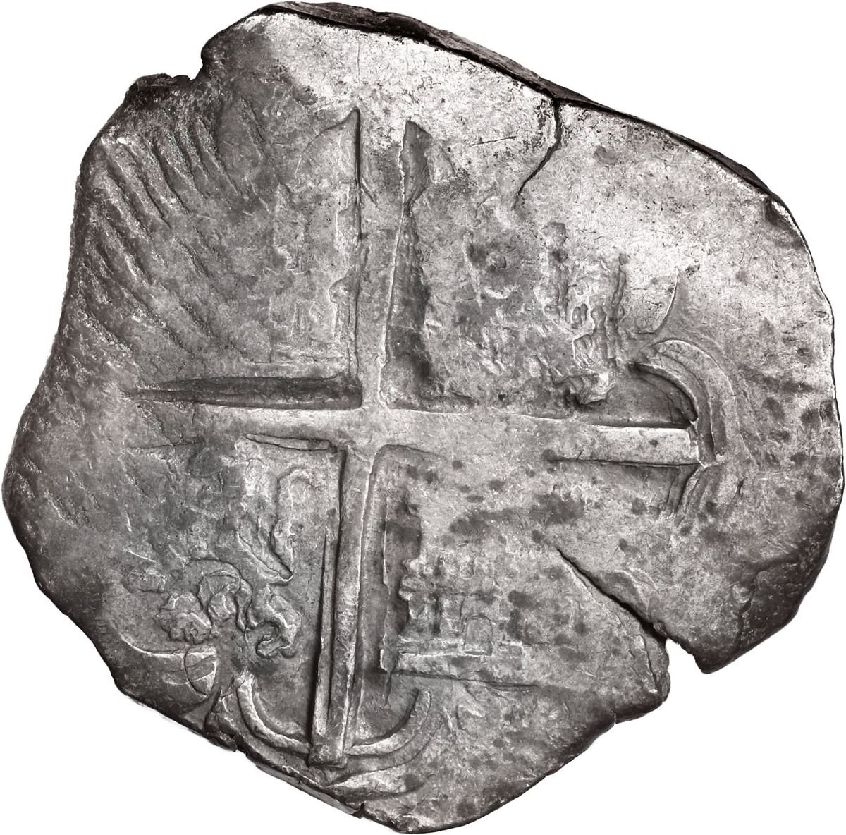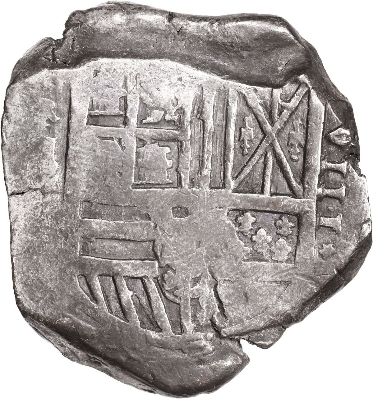 COLOMBIA, Cartagena, cob 8 reales, Philip IV, assayer E below mintmark RN to left (1626-1630). Restrepo-M45.3; S-C3; Cal-Type 298; KM-3.4. 27.59 grams. Deeply toned and chunky Fine with parts of edge rather crude (as made) and cracked, full shield with clear denomination VIII* to right and just the right side of RNE to left, nearly full cross.