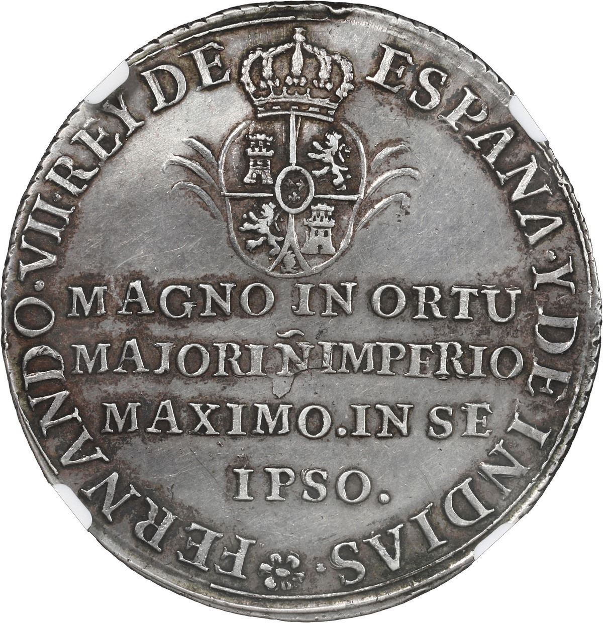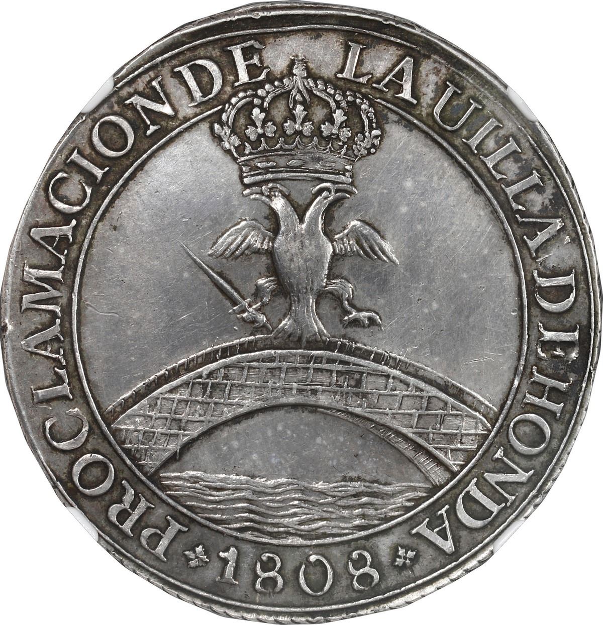 COLOMBIA, Honda, 4 reales-sized proclamation medal, Ferdinand VII, 1808, corded edge, rare, NGC AU details / cleaned. Restrepo-10 (p. 129); Herrera-22; Medina-304. 35 mm. Obverse with crowned double-headed eagle on bridge within legend PROCLAMACION DE LA UILLA DE HONDA with date 1808 at bottom (flanked by crosses-fleury); reverse with crowned arms above MAGNO IN ORTU / MAJORIN IMPERIO / MAXIMO.IN SE / IPSO. within legend [rosette] FERNANDO.VII.REY DE ESPANA.Y DE INDIAS. Attractively toned over lustrous surfaces (hairlines in open fields), particularly dark around details for great contrast, oversized but considered a 4 reales compared to other medals in 2- or 8- reales size.
