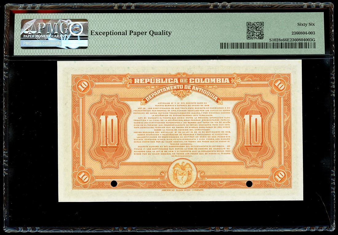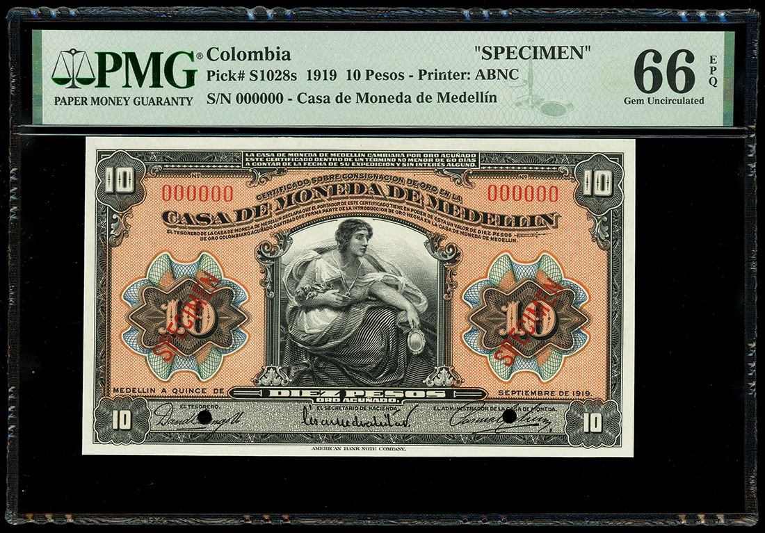 COLOMBIA, Medellín, Casa de Moneda, specimen 10 pesos, 15-9-1919, PMG Gem UNC 66 EPQ. Pick-S1028s. Two POCs. Printed by the ABNCo for use as a certificate of deposit of gold with the Casa de Moneda in Medellín. Beautifully designed note with vivid red underprint, well centered and deserving of the EPQ designation.