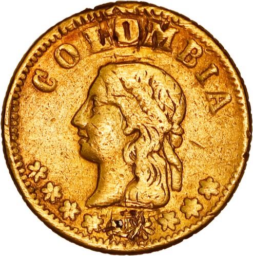 COLOMBIA, Medellín, gold 1 peso, 1864, very rare, ex-JEAS. Restrepo-320.1; Sed-29; KM-146.2; Fr-95. 1.49 grams. XF with mounting damage crudely repaired at top and bottom, from a rare two-coin issue (the other being 5 peso) only from this year and mint showing just COLOMBIA and not the whole country name at top, this denomination from a reported mintage of only 1,072 pieces (rated RRR in Sedwick). Pedigreed to the JEAS Collection.
