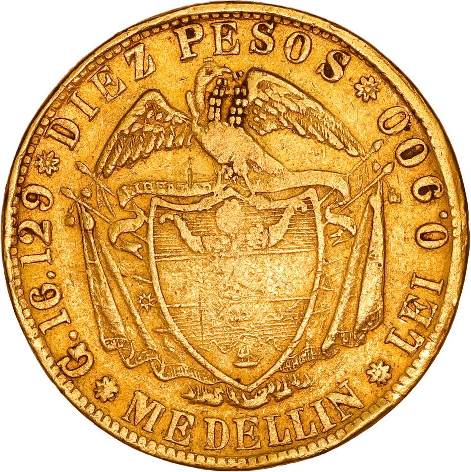 COLOMBIA, Medellín, gold 10 pesos, 1868, Bogotá effigy, reverse of 1867, ex-JEAS. Restrepo-333.4; Sed-41; KM-141.2; Fr-104. 16.06 grams. Off-center VF with only light marks, scrape in field in front of neck, scarce variety, this date rated RR in Sedwick. Pedigreed to the JEAS Collection.