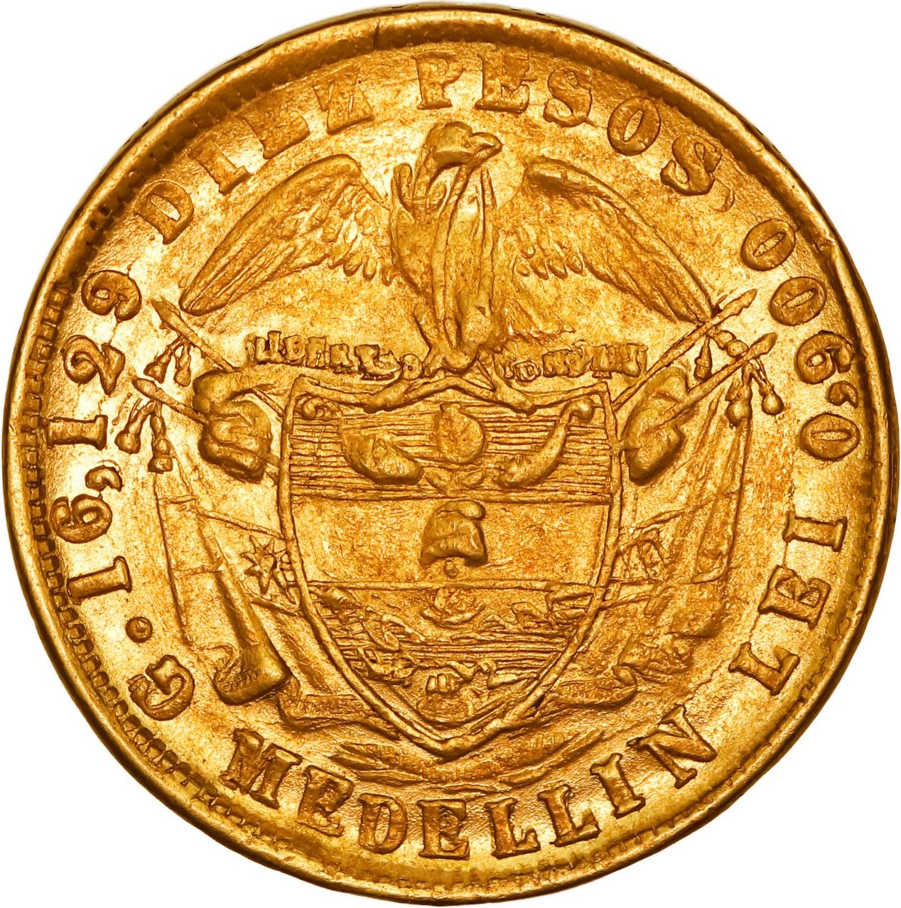 COLOMBIA, Medellín, gold 10 pesos, 1871, effigy of Medio Peso type, ex-JEAS. Restrepo-333.11; Sed-41; KM-141.2; Fr-104. 16.07 grams. AU with much luster in legends, weak Liberty, rated R in Sedwick. Pedigreed to the JEAS Collection. Note: Printed catalog calls this Cinco Decimos effigy (Restrepo-333.12) in error.