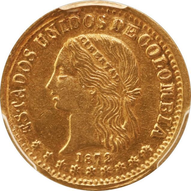 COLOMBIA, Medellín, gold 2 pesos, 1872, PCGS AU55. Restrepo-326.3; Sed-34; KM-A154; Fr-106. Luster on reverse, good color, some very minor marks and very light high-point wear only.