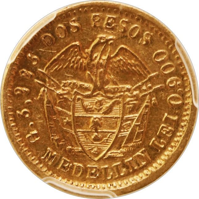 COLOMBIA, Medellín, gold 2 pesos, 1872, PCGS AU55.