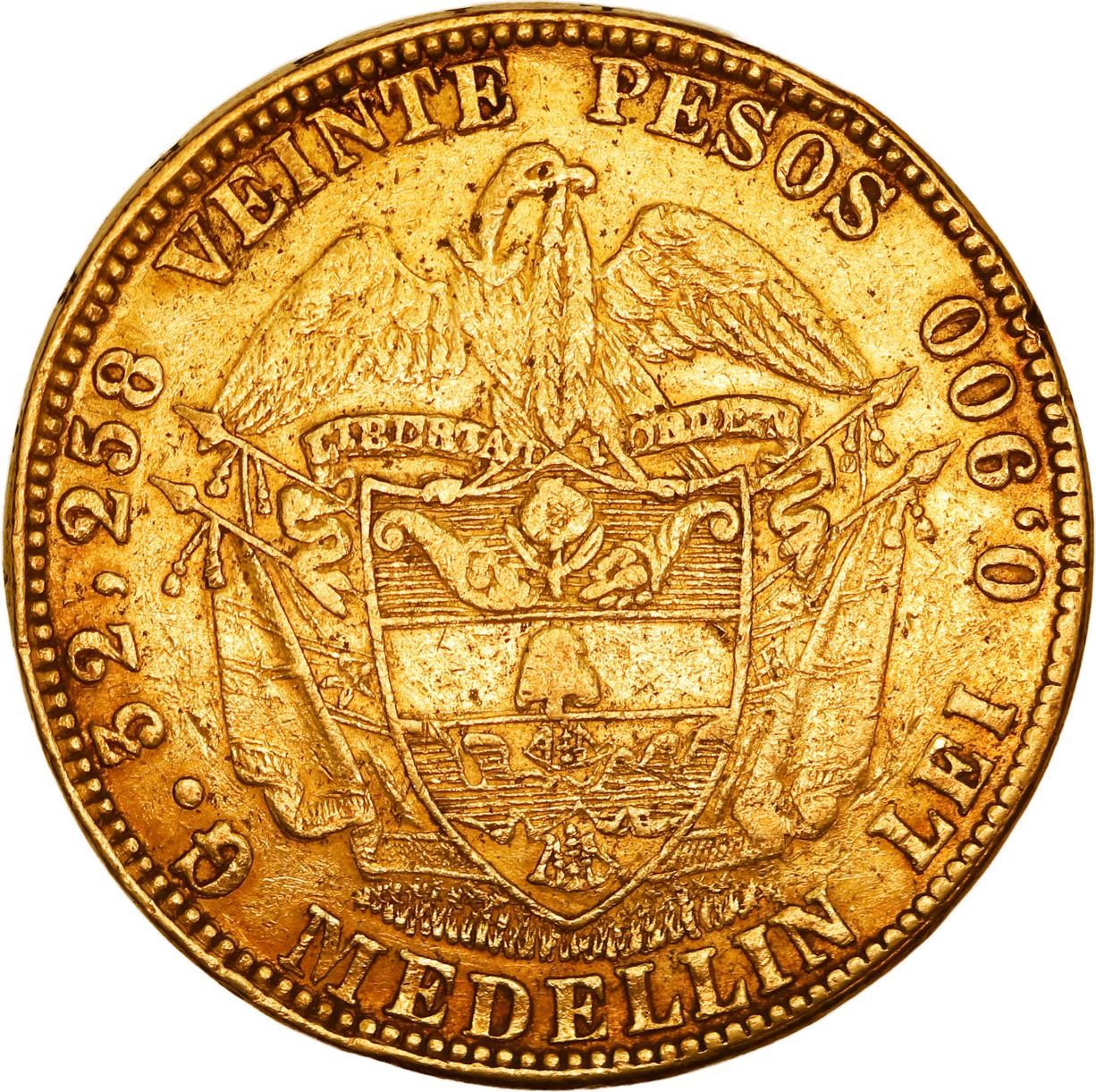 COLOMBIA, Medellín, gold 20 pesos, 1868, narrow forehead, ex-JEAS.