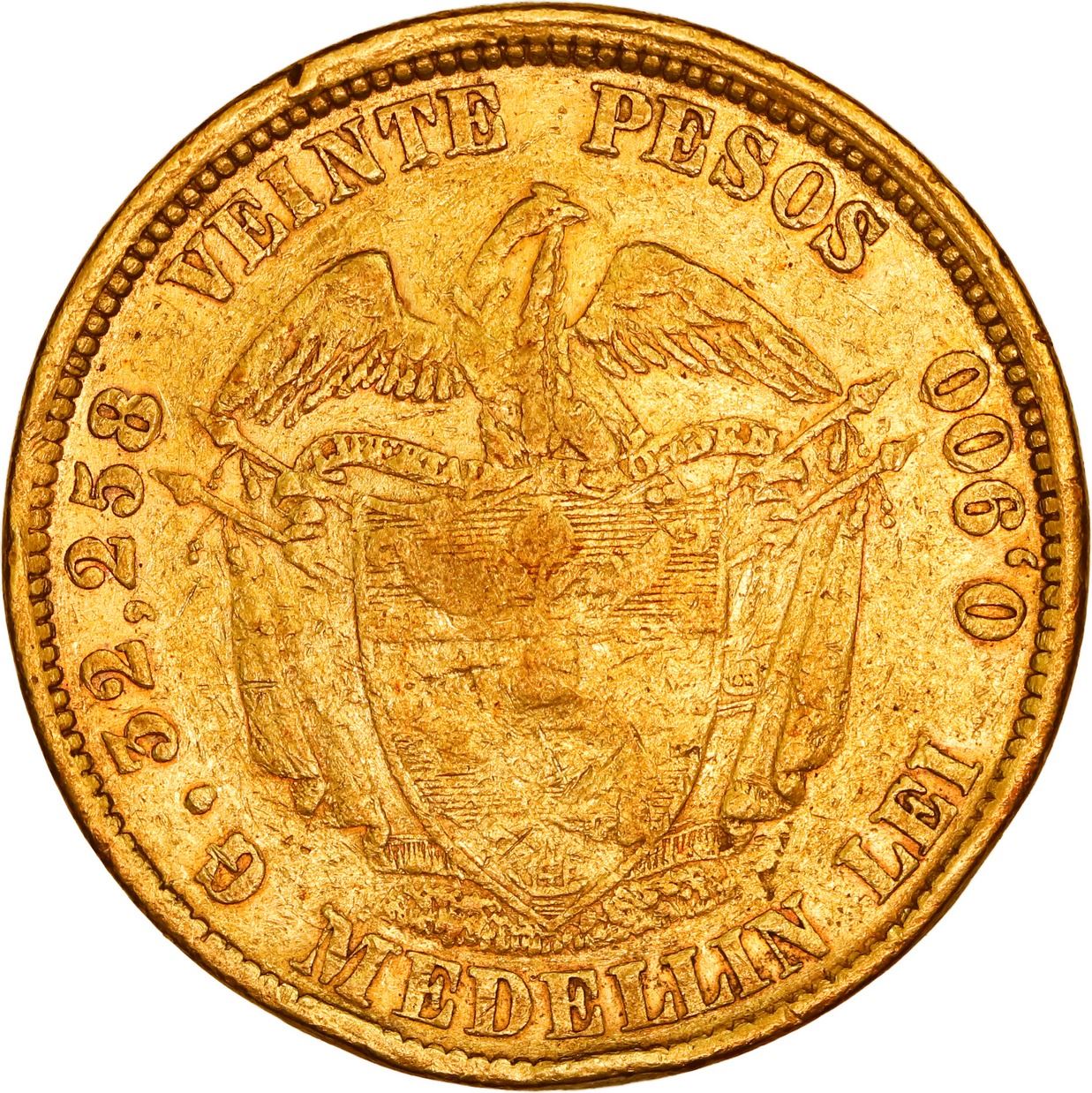 COLOMBIA, Medellín, gold 20 pesos, 1868, wide forehead, ex-JEAS. Restrepo-337.3; Sed-44; KM-142.2; Fr-101. 31.94 grams. AU with weak center on reverse, minor marks and rim-bruise plus granular surfaces as usual, scarce and popular type (this date not noted as rare in Restrepo but rated RRR in Sedwick). Pedigreed to the JEAS Collection.