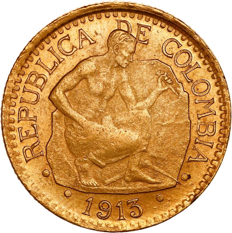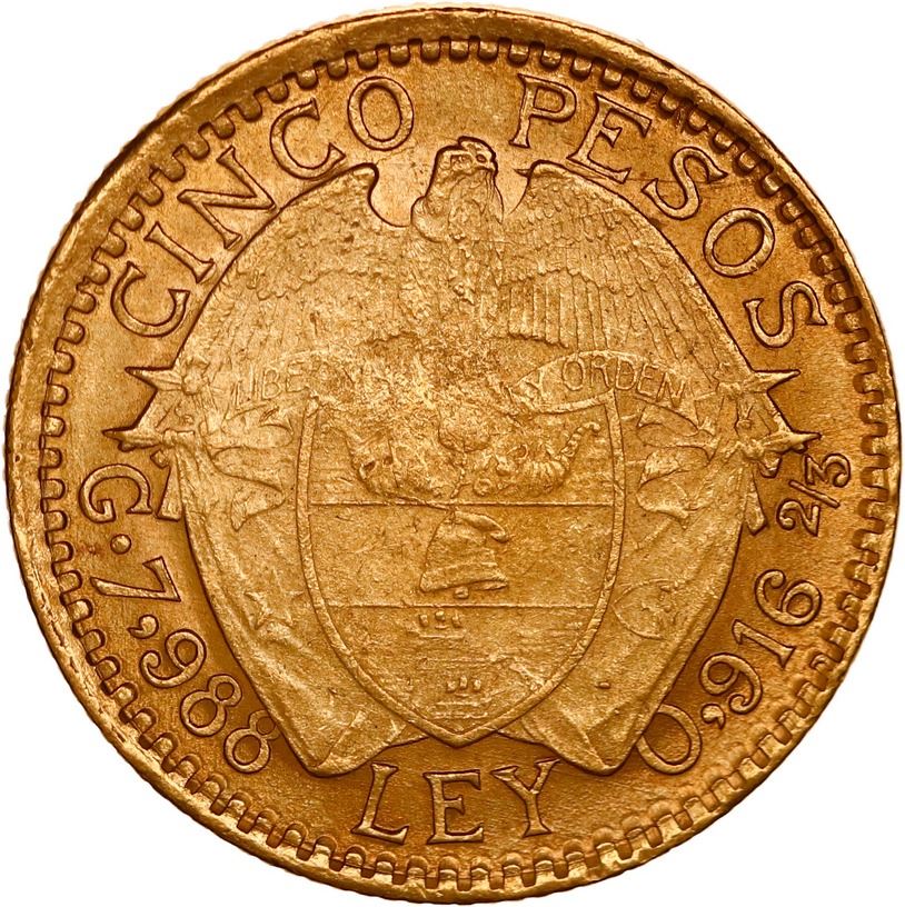 COLOMBIA, Medellín, gold 5 pesos, 1913, ex-JEAS. Restrepo-453.1; KM-195.1. 7.99 grams. AU+ with weakly struck central detail, quite lustrous (AGW 0.2355 oz). Pedigreed to the JEAS Collection.